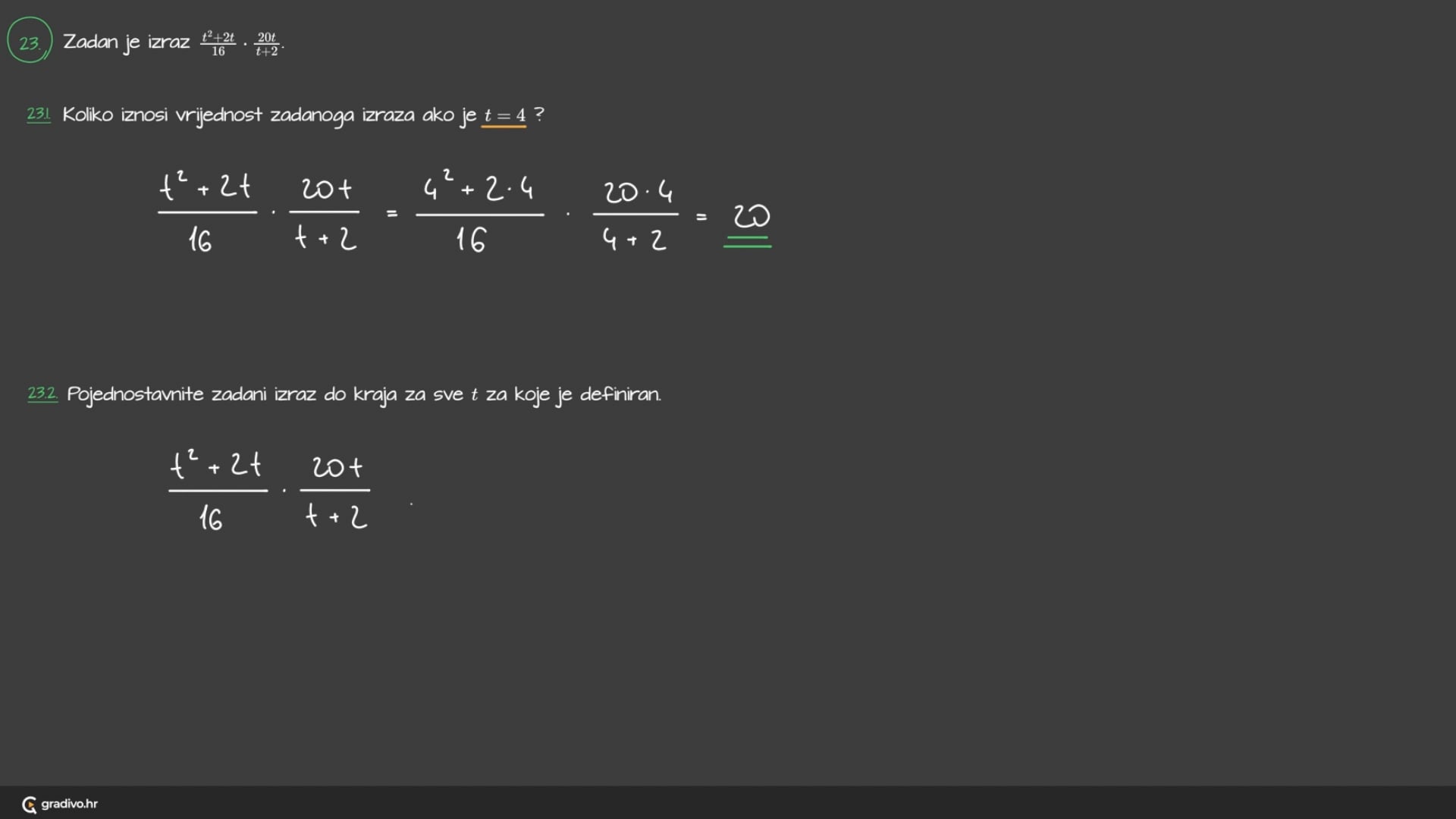 23.2. Pojednostavnite zadani izraz do kraja za sve $t$ za koje je definiran.