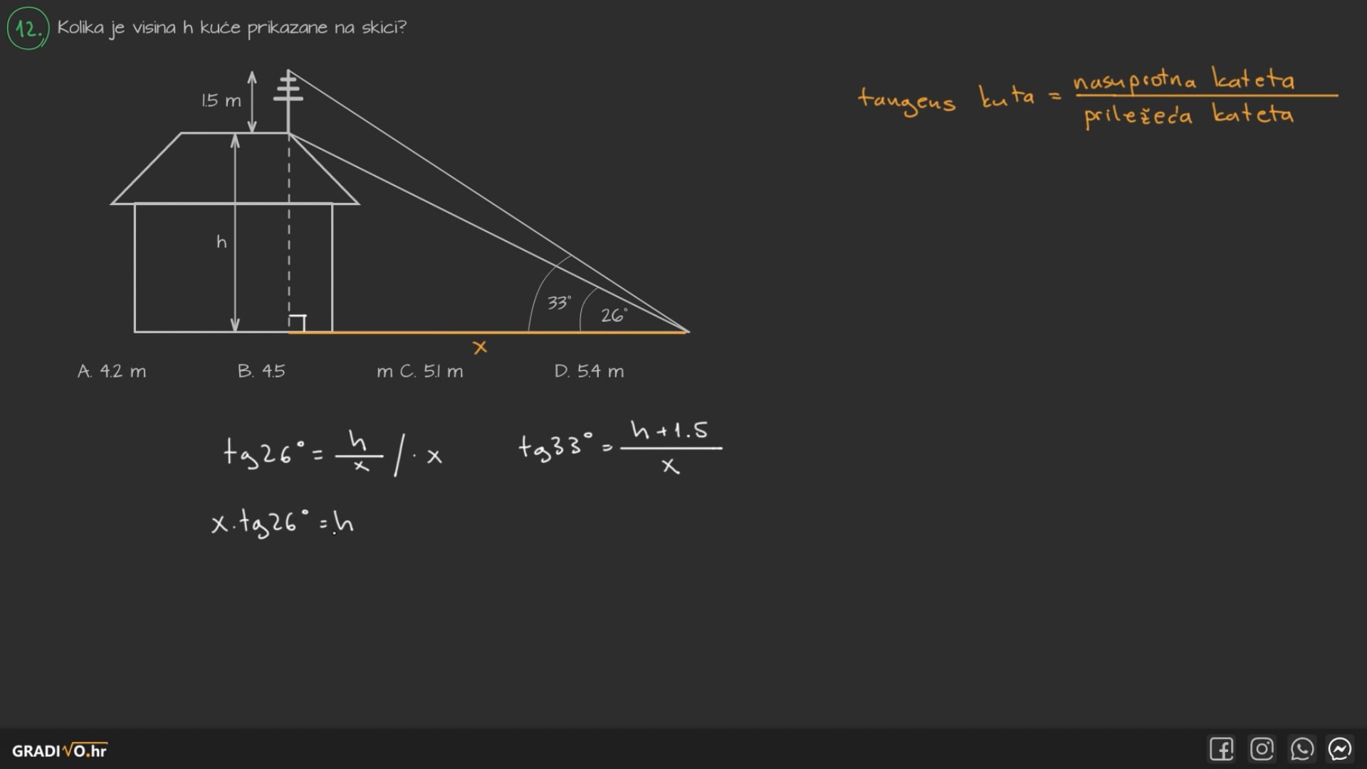 Tangens je omjer nasuprotne i priležeće katete. Za kut $\alpha$, oznaka je $\operatorname{tg}\alpha$.