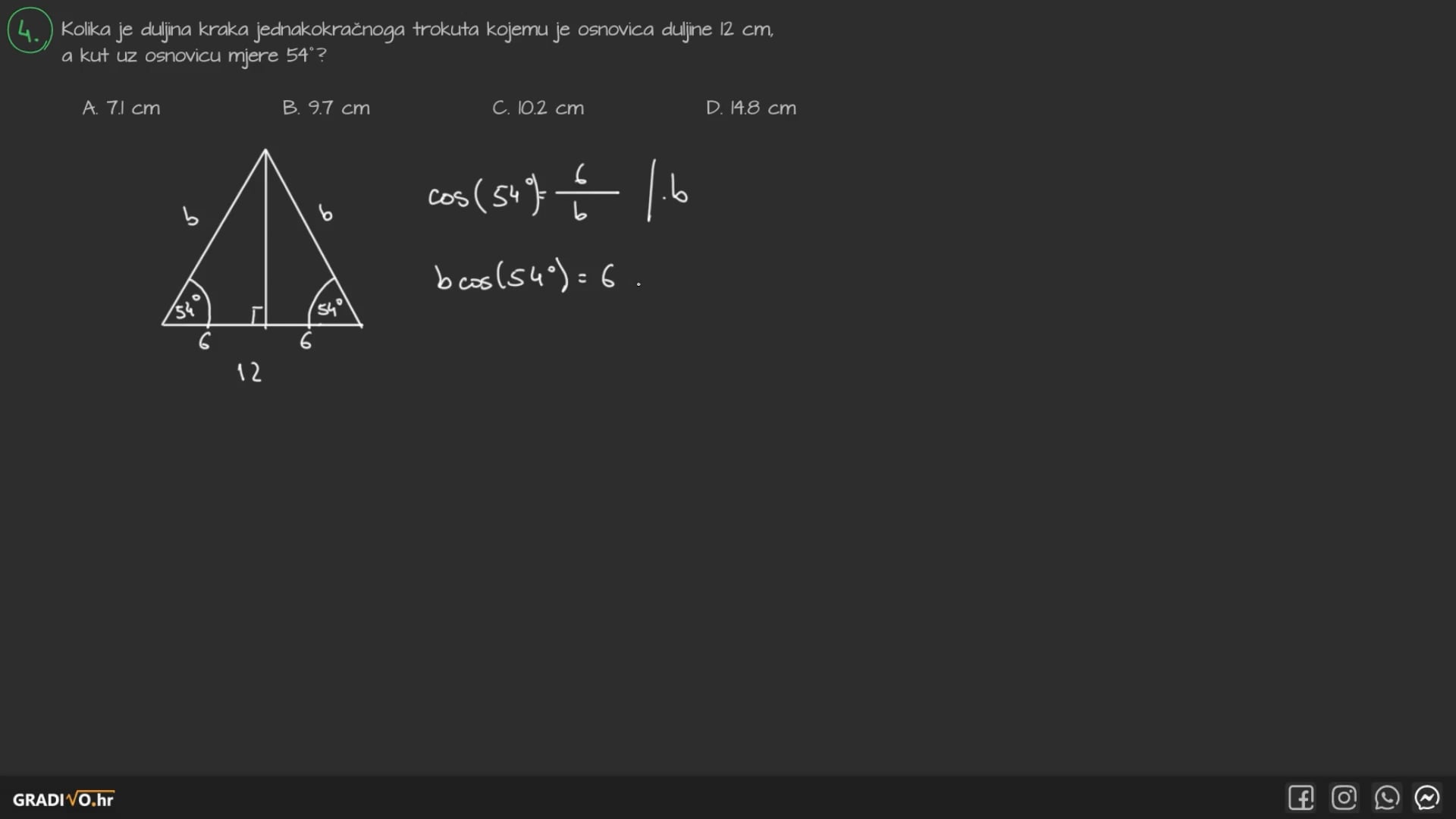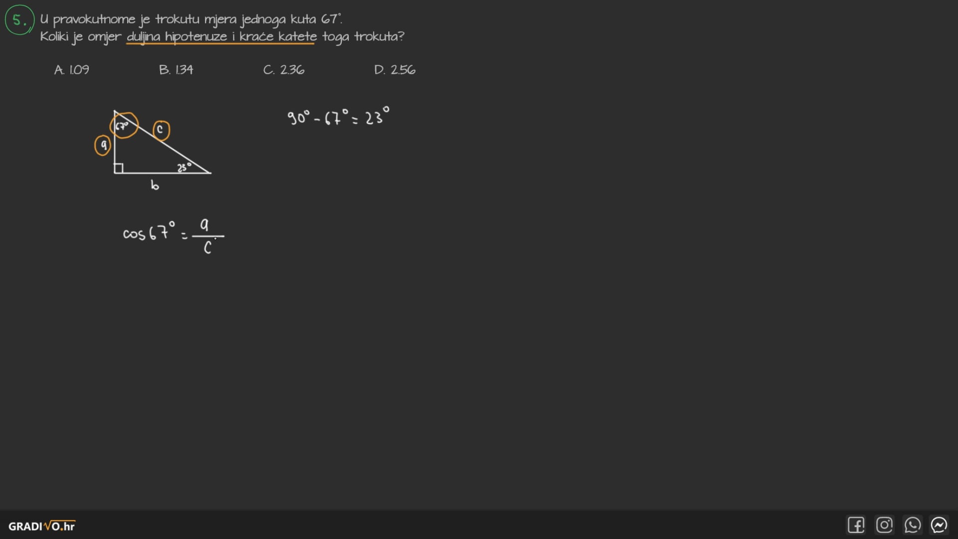 Kosinus je omjer priležeće katete i hipotenuze. Za kut $\alpha$, oznaka je $\cos\alpha$.