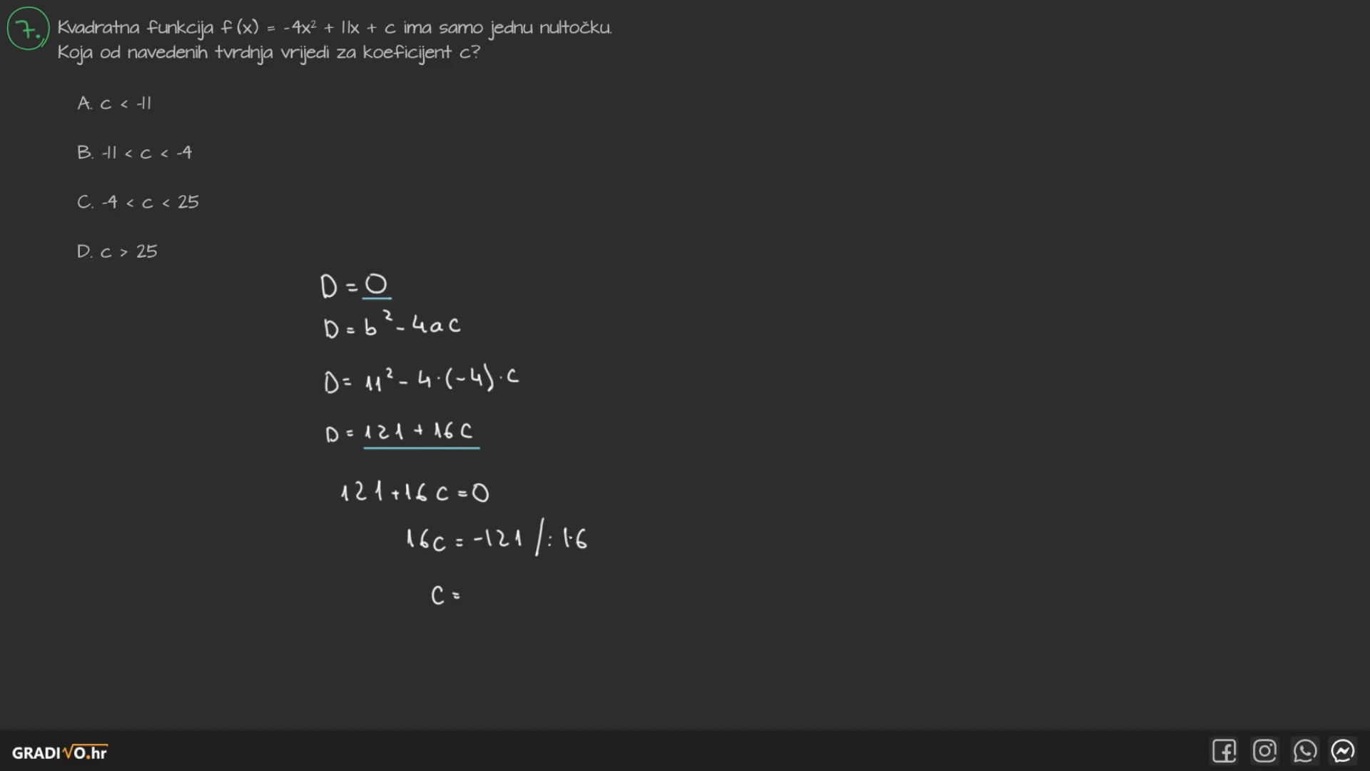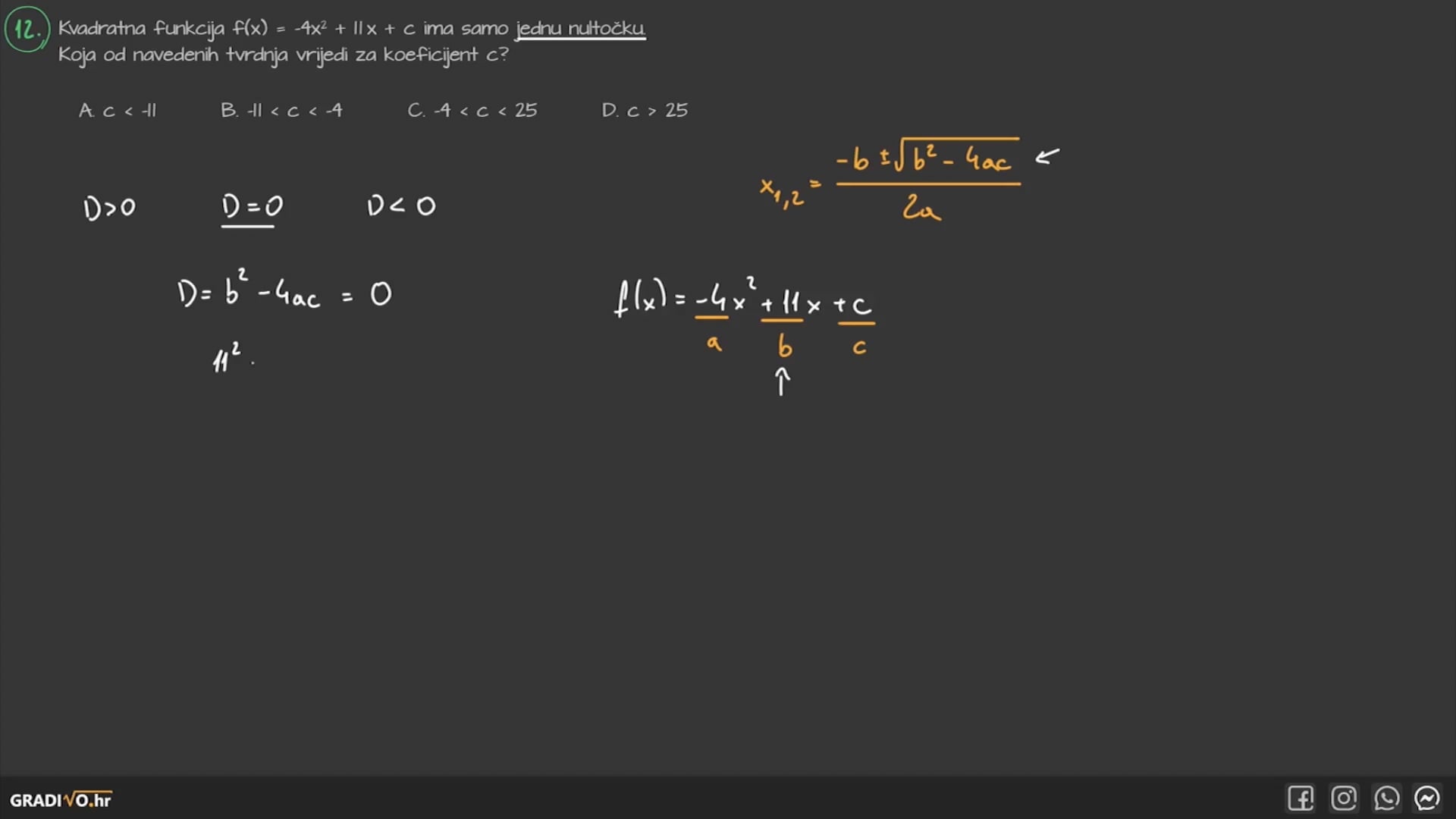 Slično kao u prošloj lekciji, diskriminanta će nam govoriti koliko imamo nultočki na grafu kvadratne funckije. Formula je ista $D = b^2 -4ac$.