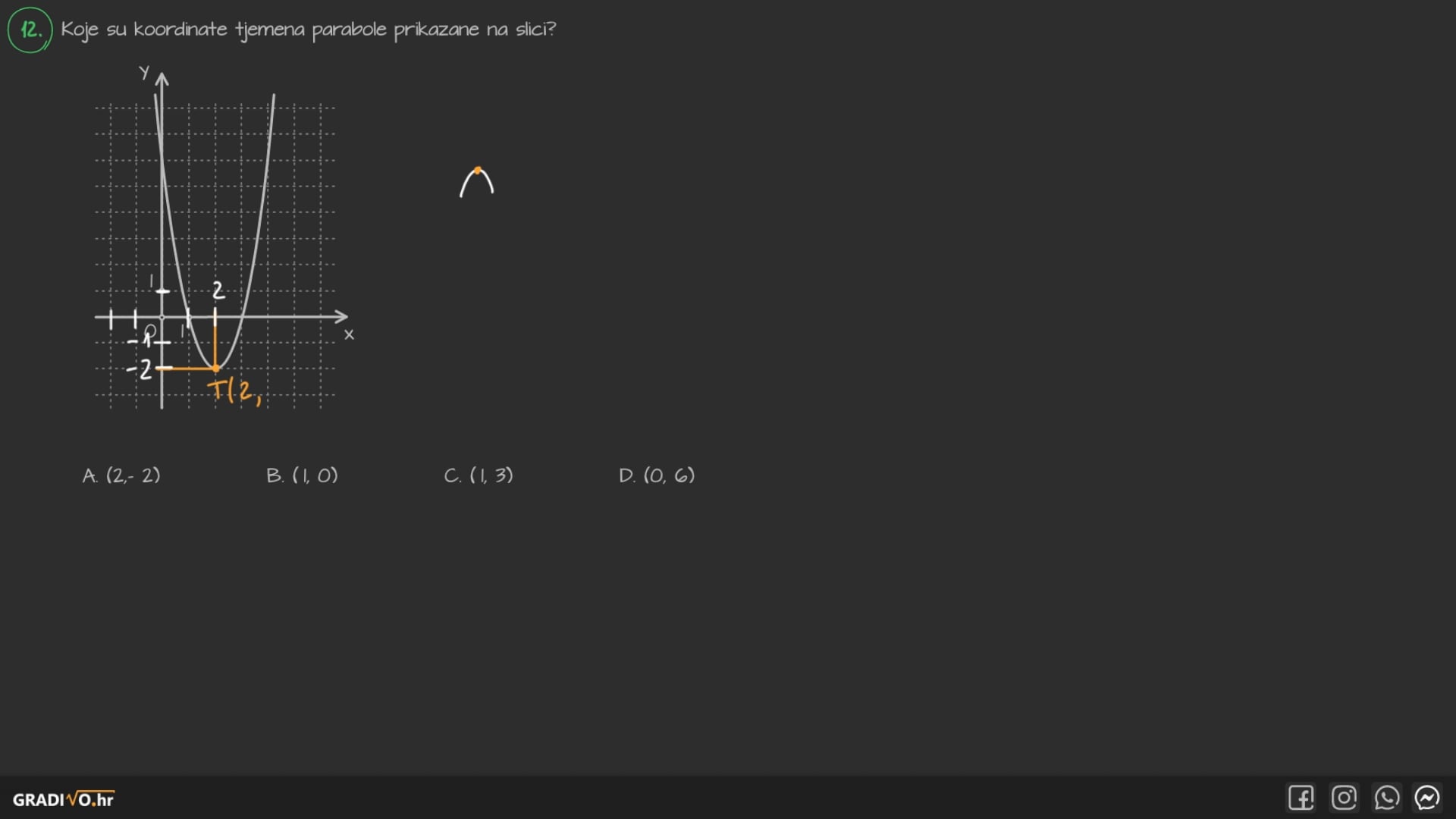 Tjeme parabole $T$ s koordinatama $(x_0, y_0)$ je "najisturenija" točka parabole, a koordinate dobivamo formulom:
