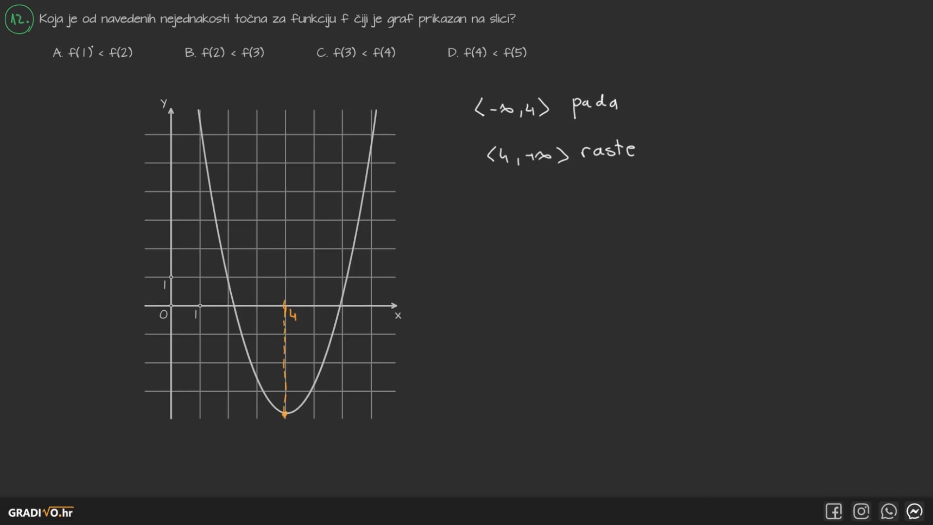 U slučaju minimuma, kvadratna funkcija će se prvo spuštati do tjemena, odnosno padati, a onda uspinjati, odnosno rasti. Kod maksimuma je obrnuto, prvo rastemo do tjemena, a onda padamo.