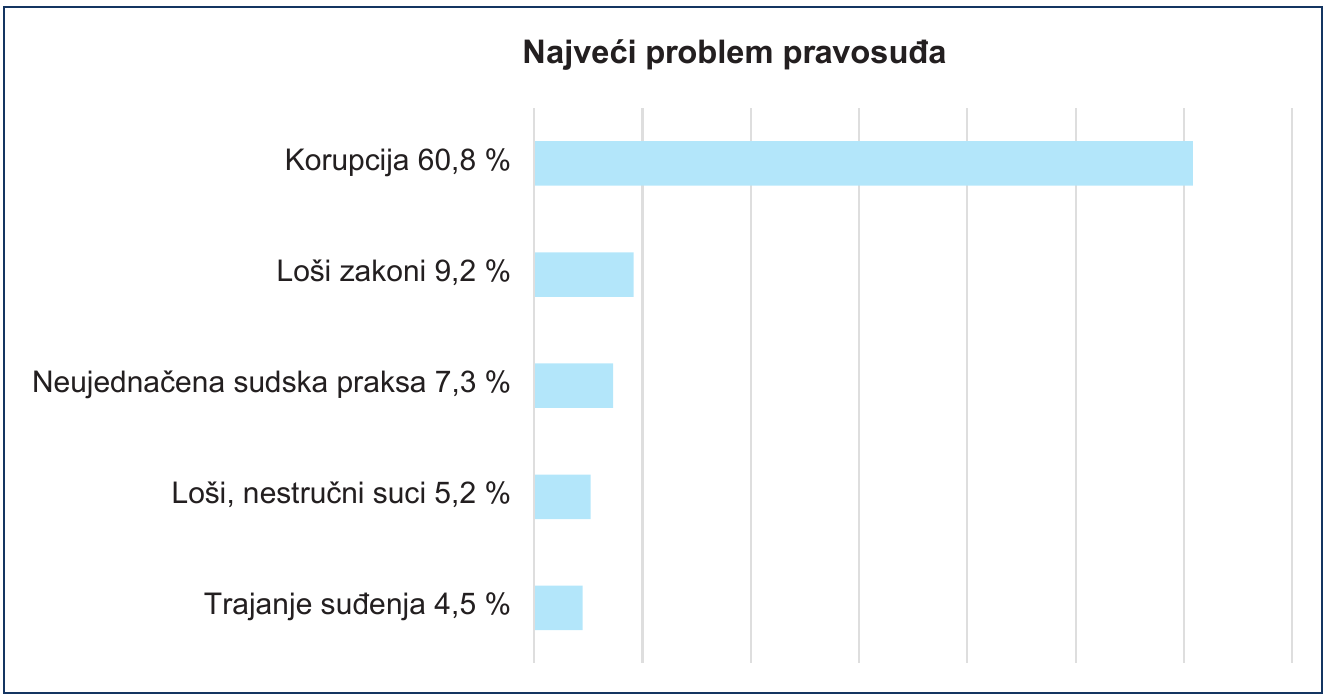 Rezultati istraživanja javnosti u proljeće 2021. pokazali su da veliki broj građana nema povjerenje u hrvatsko pravosuđe. Promotrite grafikon u kojemu su navedeni najveći problemi pravosuđa prema percepciji ispitanih građana.