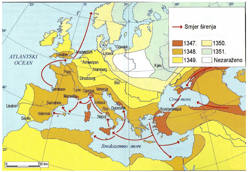 47. Smjer širenja koje bolesti prikazuje povijesni zemljovid?