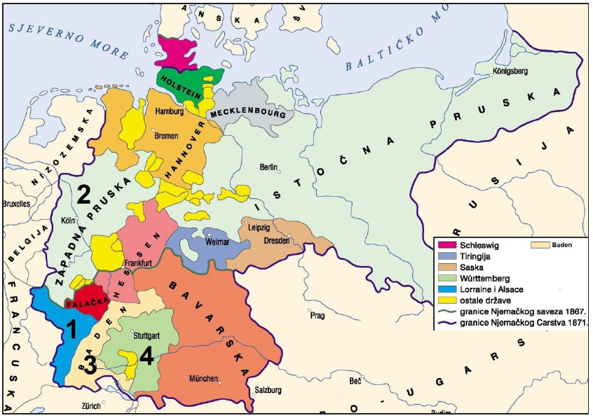 Kojim je brojem na povijesnome zemljovidu obilježen teritorij koji je Njemačka stekla u Francusko-pruskome ratu?