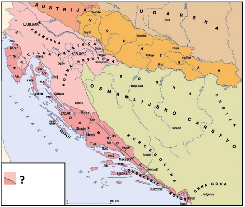 Koji je grad od 1809. do 1813. godine bio središte prostora koji su na legendi povijesnoga zemljovida obilježeni upitnikom?