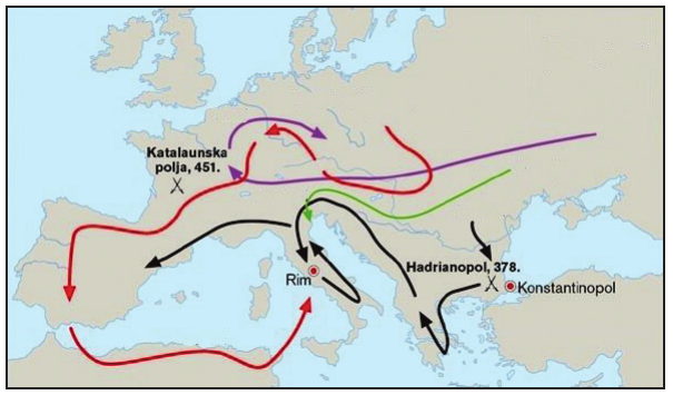 73.2. Koji se pojam upotrebljava u općoj kulturi kao posljedica djelovanja naroda čiji je smjer seobe na povijesnome zemljovidu označen crvenim strelicama?