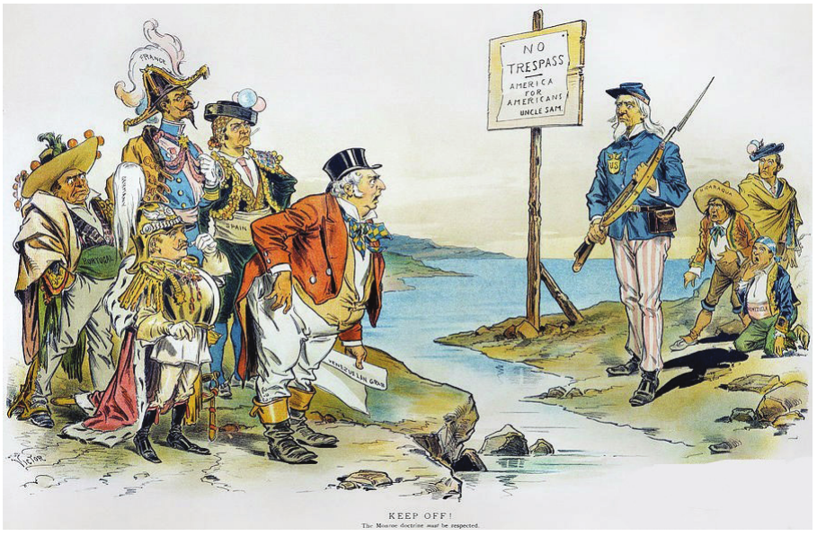 Prijevod teksta sa slikovnoga priloga: Na znaku: Nema prolaza. Amerika Amerikancima. Ujak Sam. Ispod crteža: Držite se podalje! Monroeova doktrina mora se poštivati!