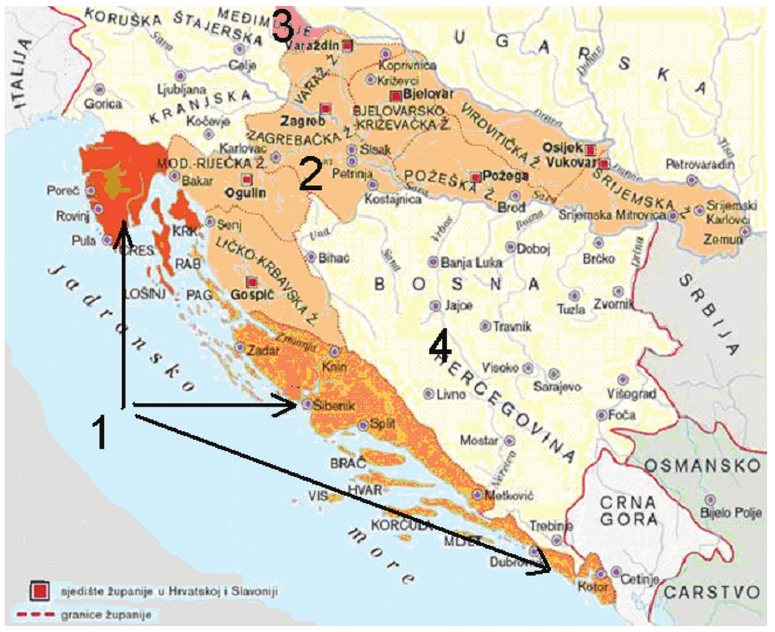 48. Pozorno proučite povijesni zemljovid hrvatskih zemalja i Bosne i Hercegovine pred Prvi svjetski rat. Prostorima obilježenima brojevima od 1 do 4 pridružite upravno-pravnu pripadnost ili status.