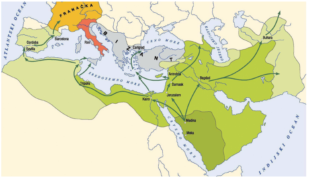 54. Pozorno proučite povijesni zemljovid Sredozemlja u ranome srednjem vijeku i odgovorite na postavljena pitanja.