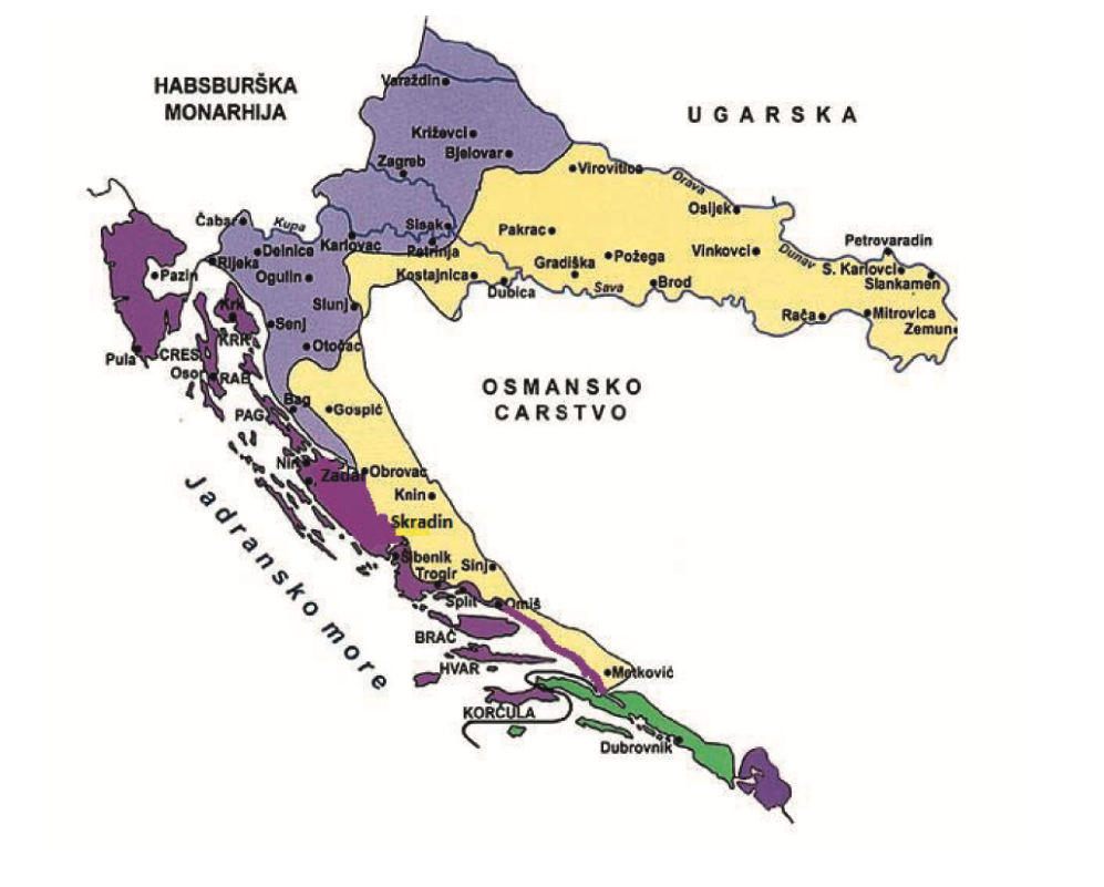 41. Kojim su mirom oslobođeni hrvatski prostori od osmanlijske vlasti, a označeni su na zemljovidu žutom bojom?