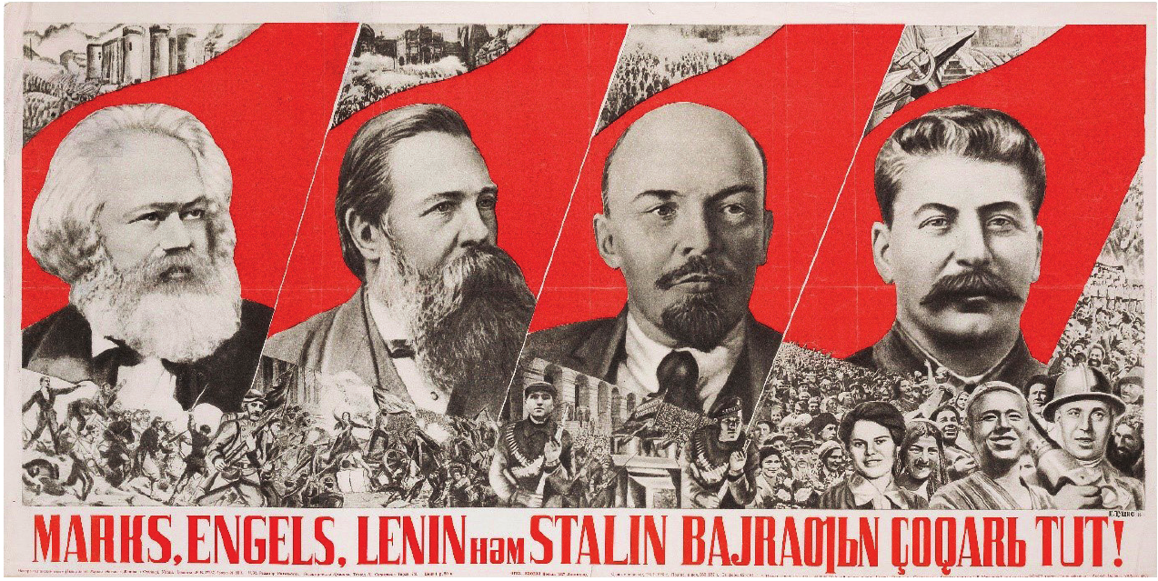 Prijevod teksta sa slikovnoga priloga: Podignite visoko zastavu Marxa, Engelsa, Lenjina i Staljina!