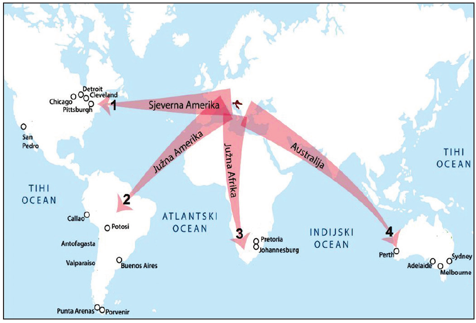 Kojim je brojem na povijesnome zemljovidu označen smjer migracija hrvatskoga stanovništva koji su 1894. godine osnovali Hrvatsku zajednicu?