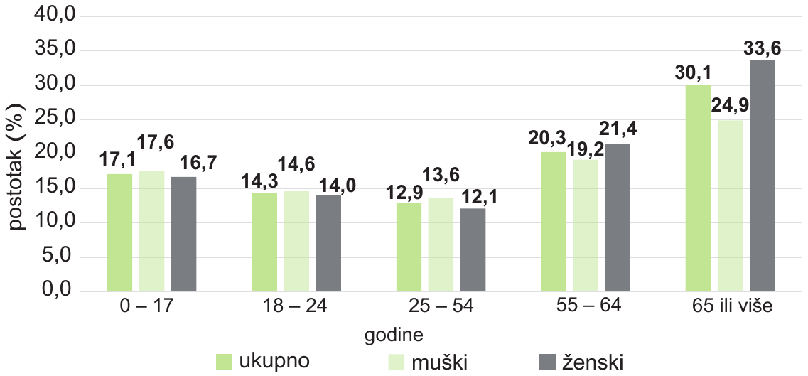 31.1. Navedite prema grafičkome prikazu dobnu skupinu koja ima najnižu stopu rizika od siromaštva i spol skupine u kojoj je zabilježena najviša stopa siromaštva.