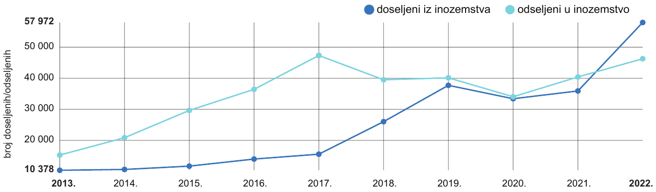 A. broj doseljenih i odseljenih stagnira