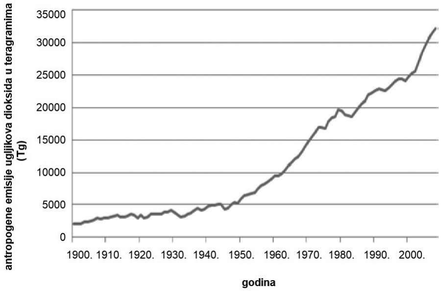 Grafički prikaz 1. Antropogene emisije ugljikova dioksida u teragramima (Tg) od 1900. do 2007. godine