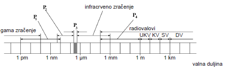 Na slici je prikazan spektar elektromagnetskih valova po valnim duljinama. U kojemu se dijelu spektra označenoga s $\mathbf{P}_{1}, \mathbf{P}_{2}, \mathbf{P}_{3}$ ili $\mathbf{P}_{4}$ nalaze mikrovalovi?