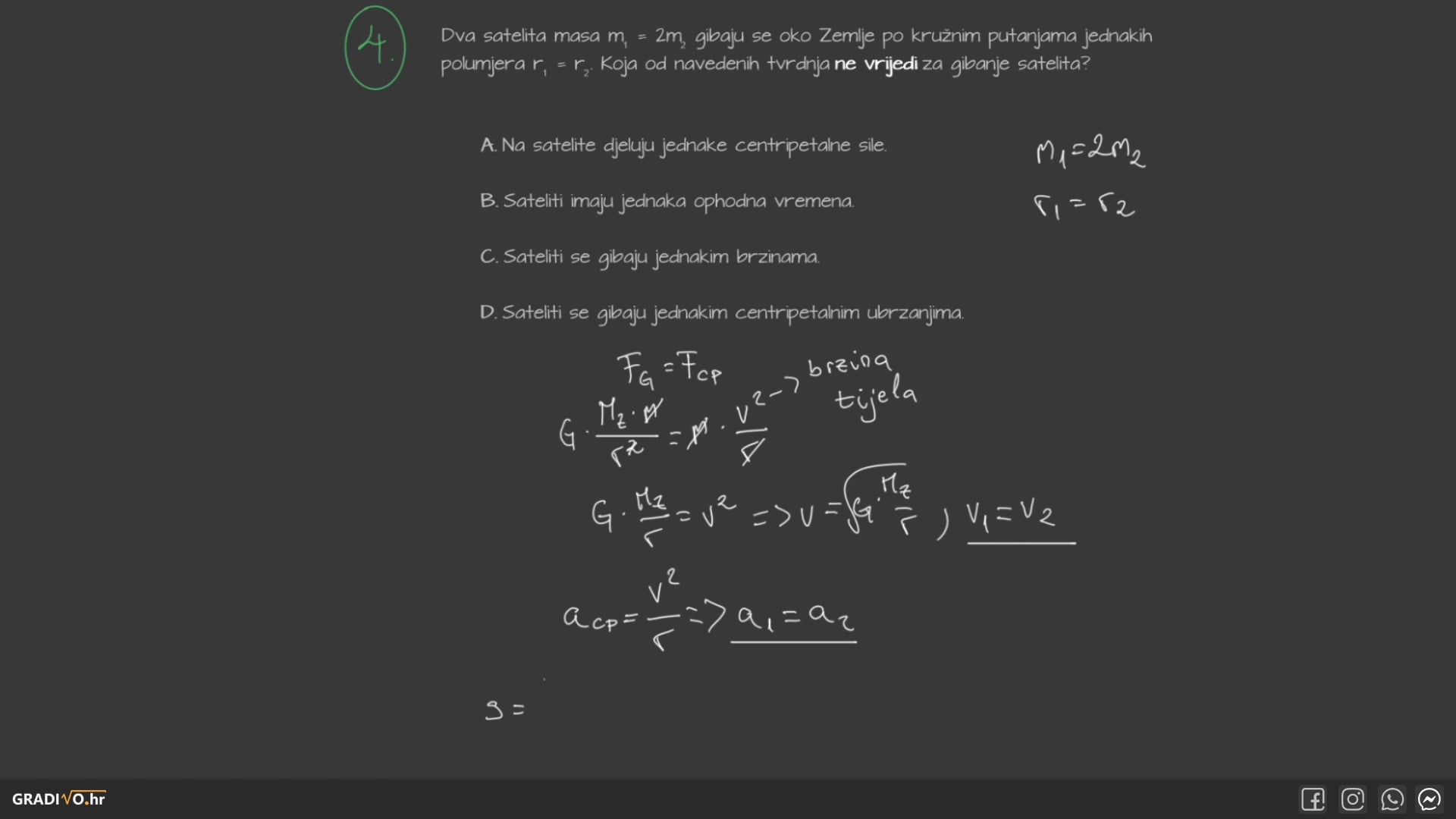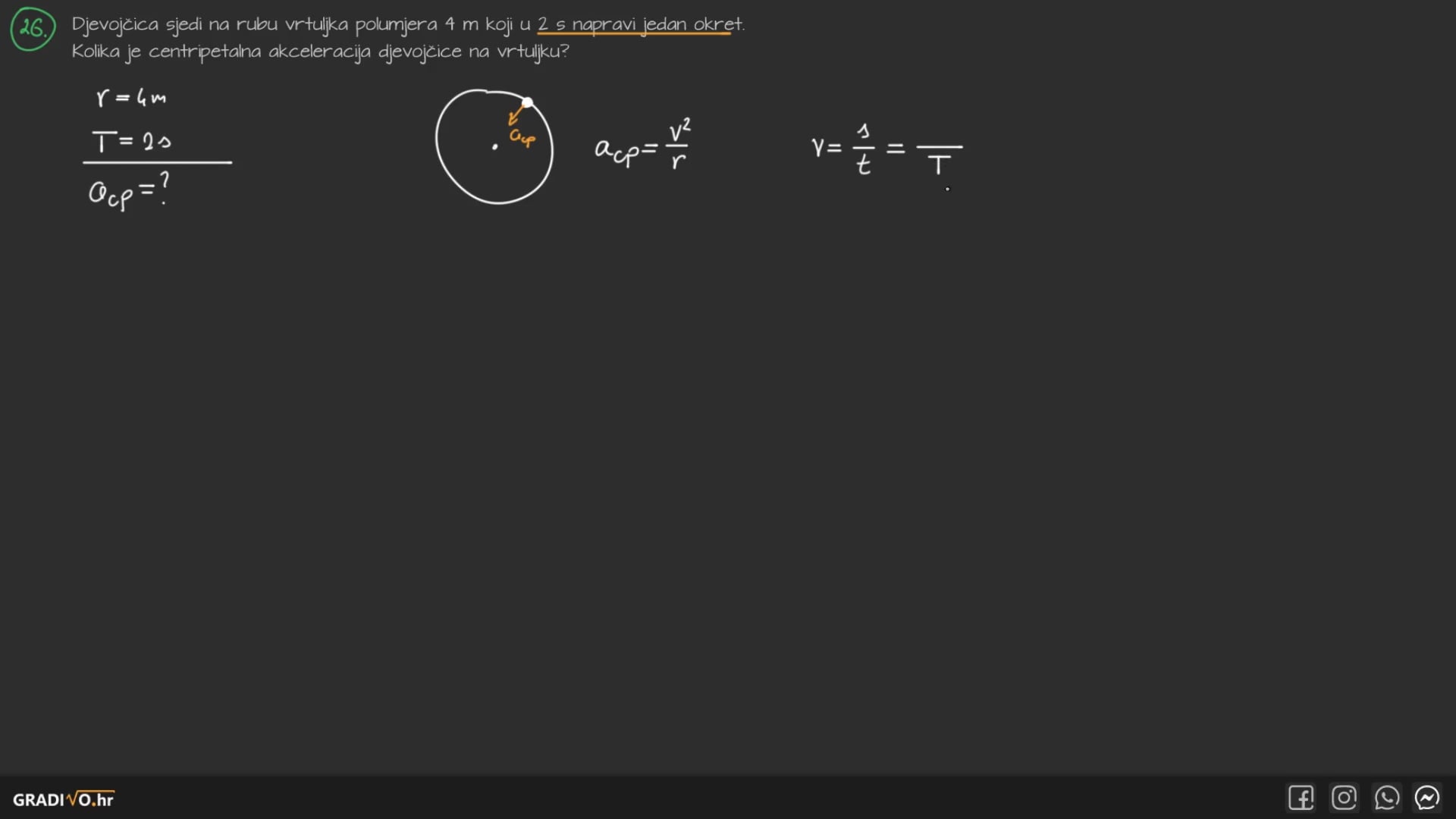 Centripetalna ili normalna akceleracija \(a_{cp}\) u svakom je trenutku gibanja okomita na obodnu brzinu, to jest, uvijek ima smjer prema središtu kružnice. Ona je odgovorna za promjenu smjera obodne brzine i po iznosu je jednaka: