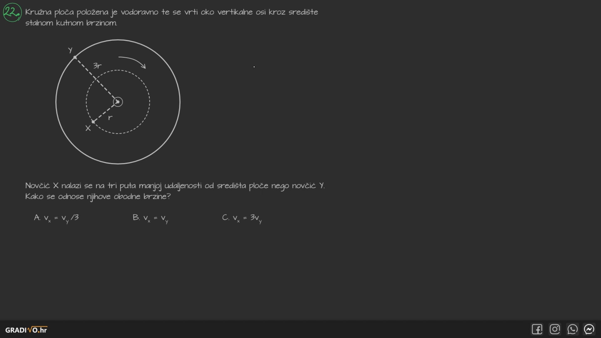 Brzina \(\vec{v}\) je tangencijalna na putanju (kružnicu) u svakom trenutku gibanja i zovemo ju obodna brzina.