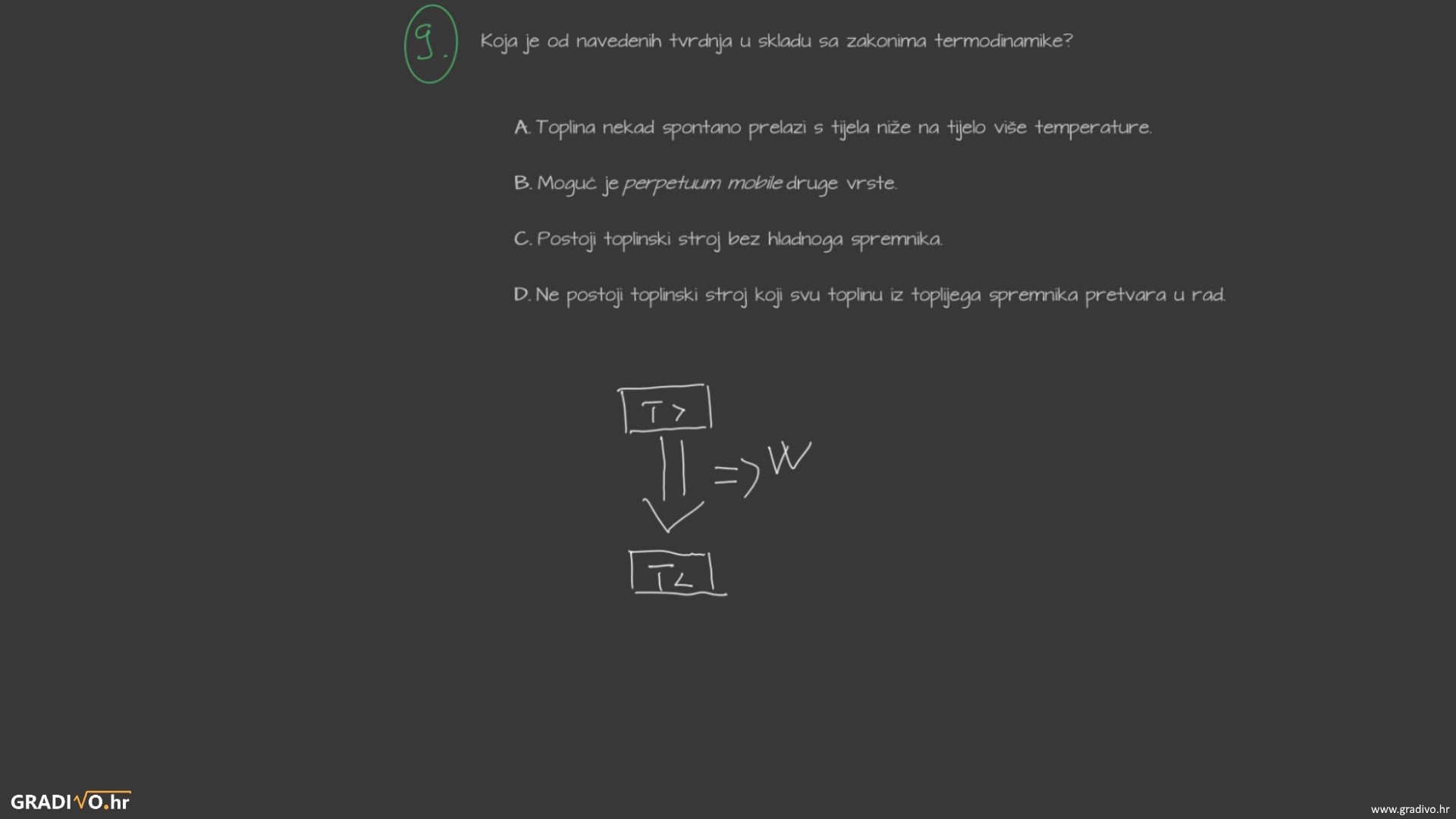 Toplina spontano može prelaziti samo s toplijeg spremnika na hladniji, ne i obrnuto. Da bi toplina prešla s hladnijeg tijela na toplije potrebno je uložiti dodatni rad. Odnosno, ne postoji stroj koji uzima toplinu spremnika niže temperature i predaje ju toplijem spremniku bez uloženog rada.