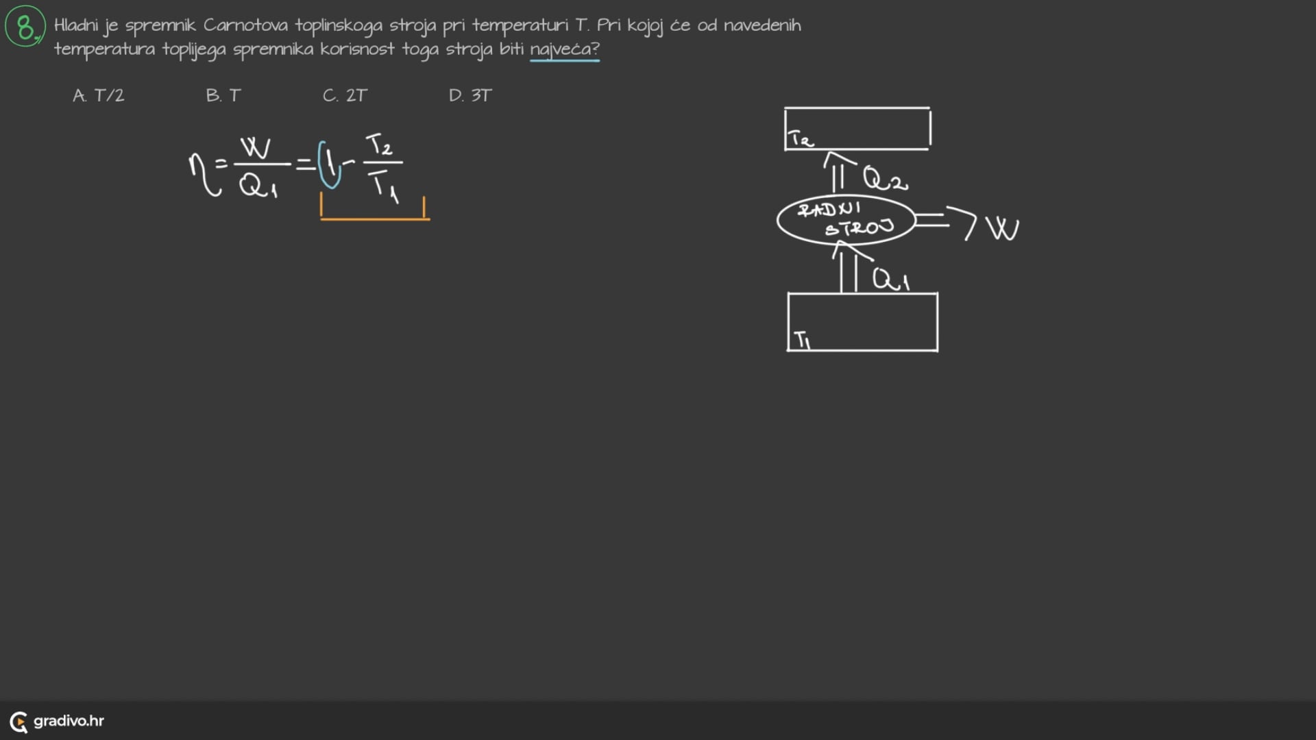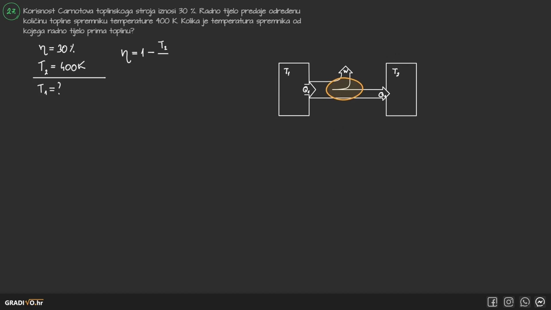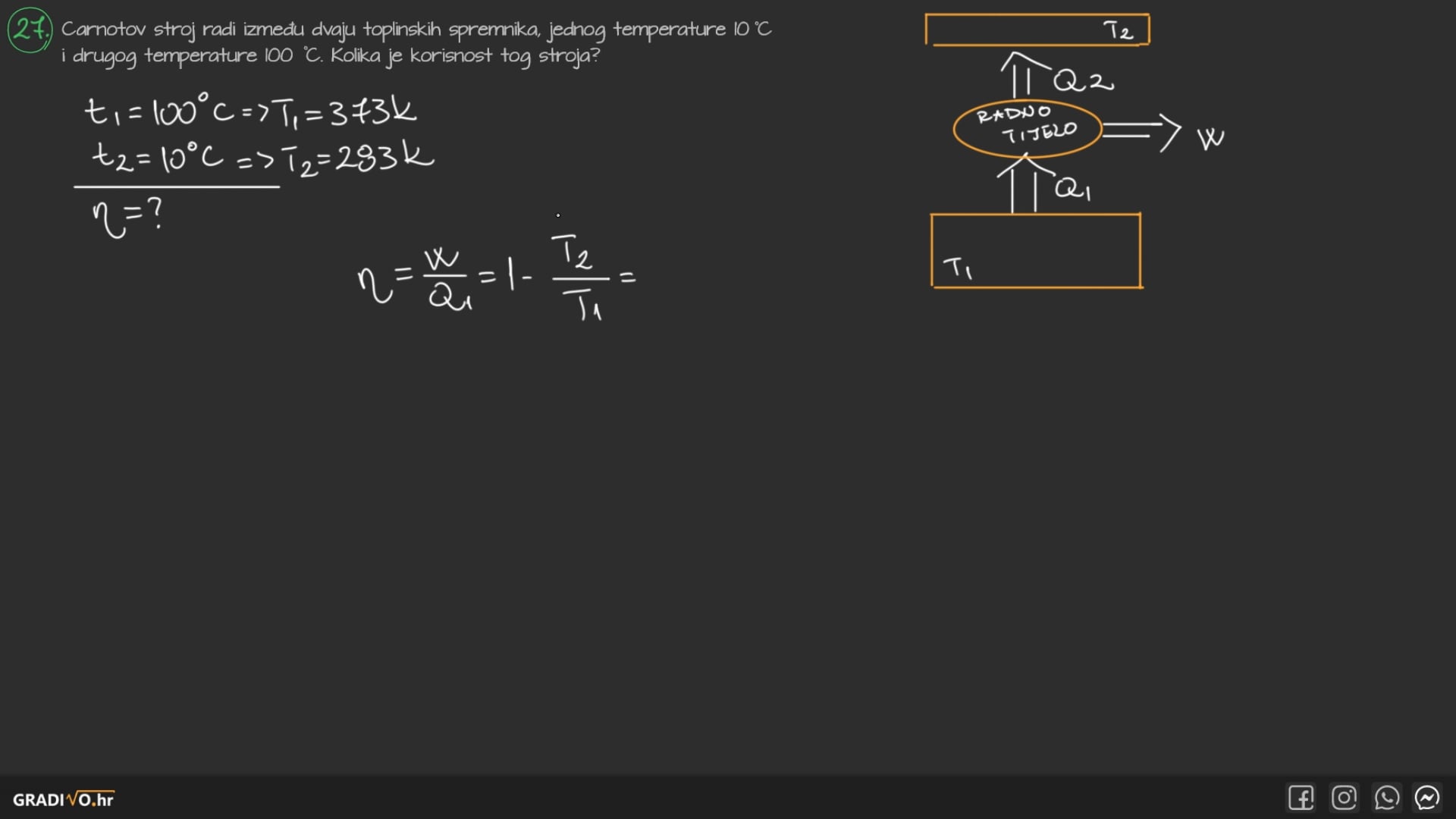 Korisnost toplinskog stroja definiramo kao omjer obavljenog rada \(W\) i primljene topline \(Q_1: \)