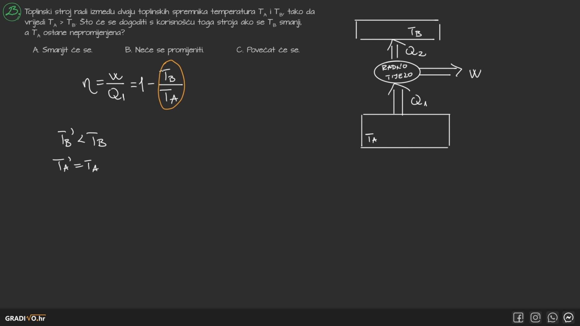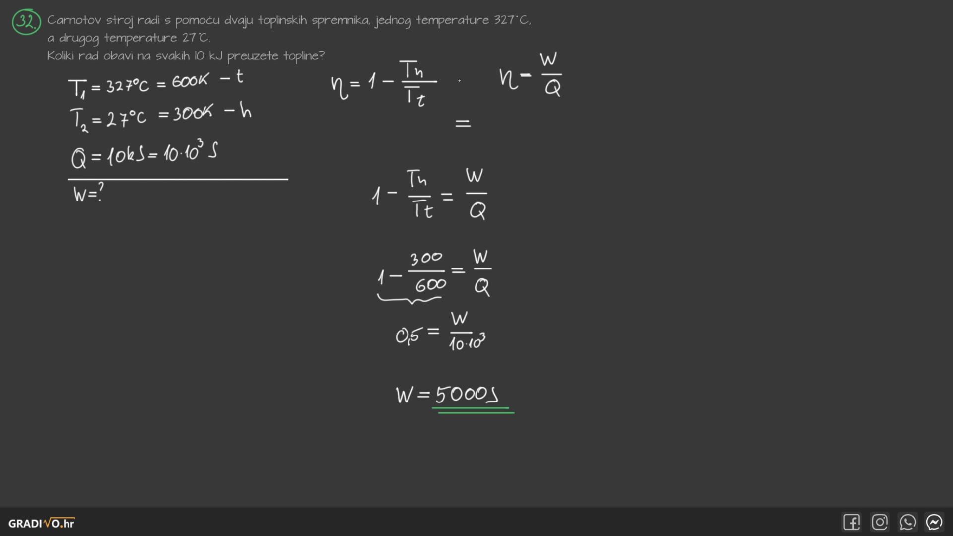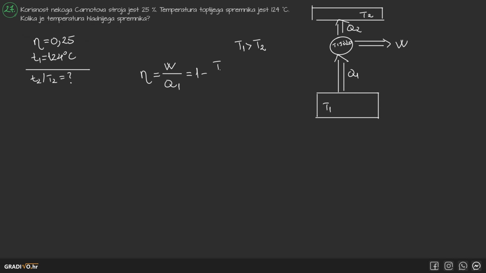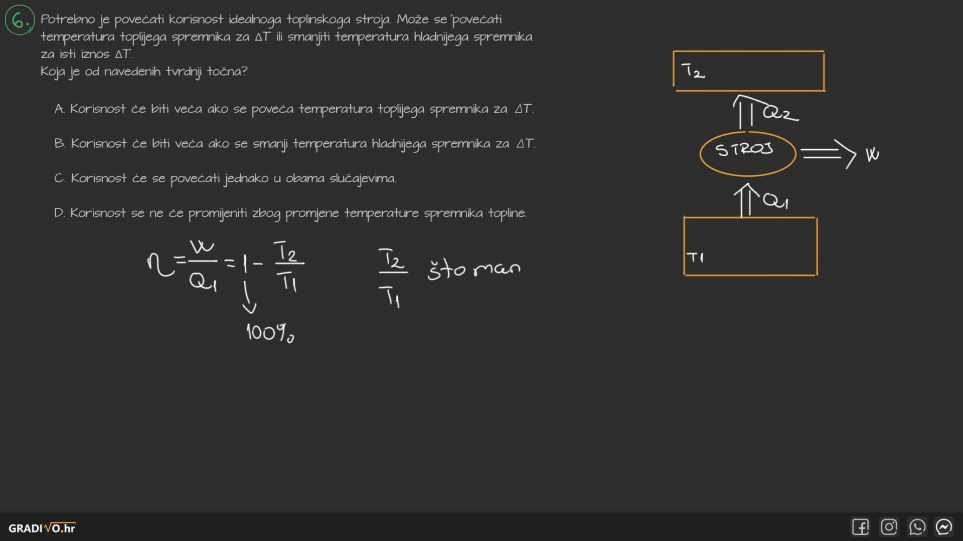 Korisnost toplinskog stroja definiramo kao omjer obavljenog rada \(W\) i primljene topline \(Q_1: \)