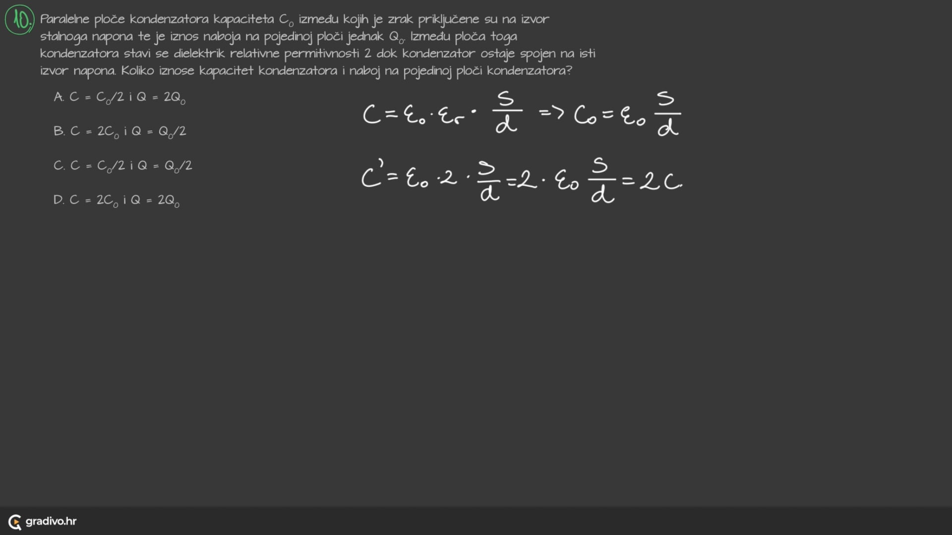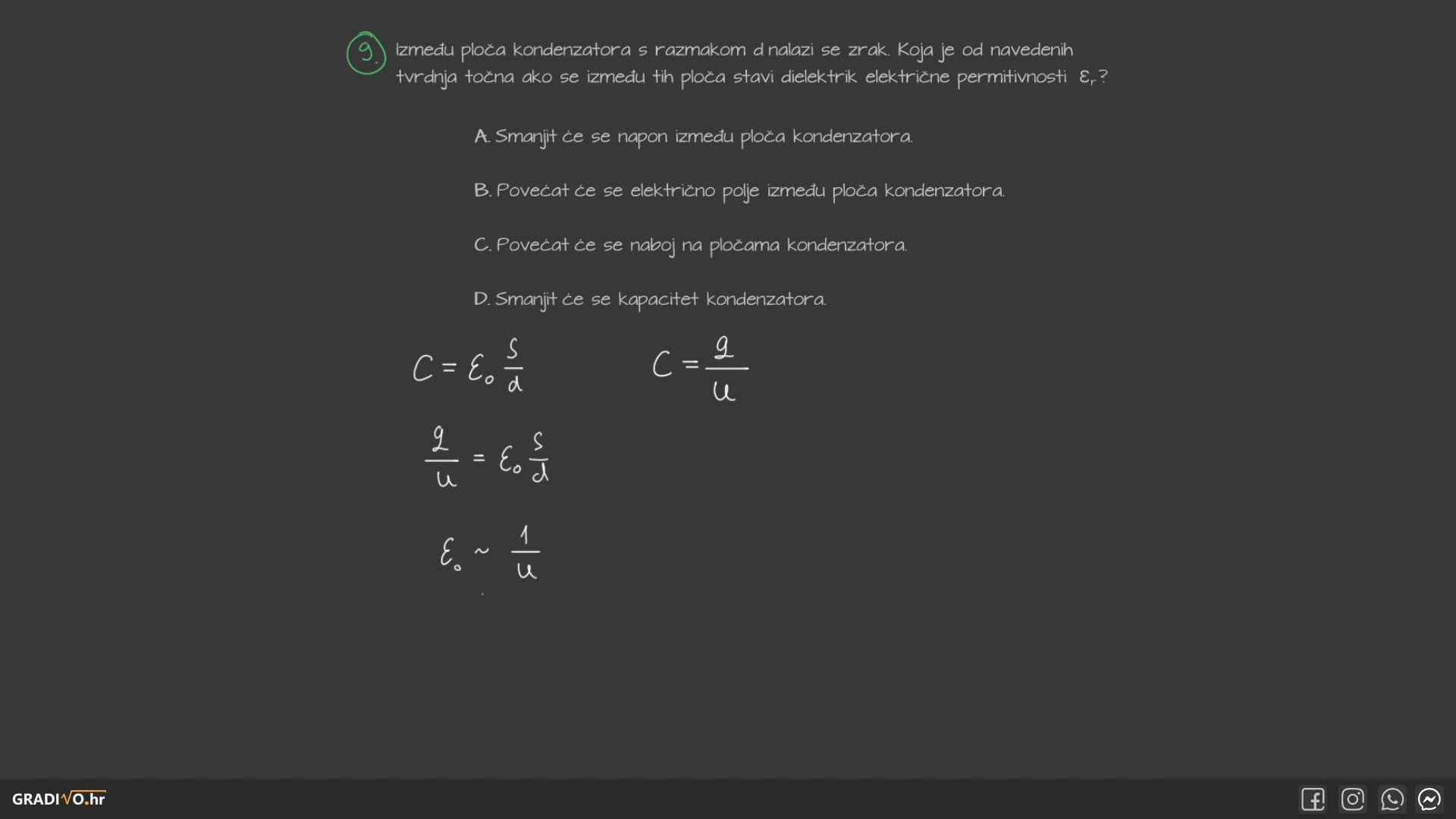 Relativna dielektrična permitivnost vakuuma \(\varepsilon_r = 1\). To znači da je kapacitet kondenzatora u vakuumu jednak: