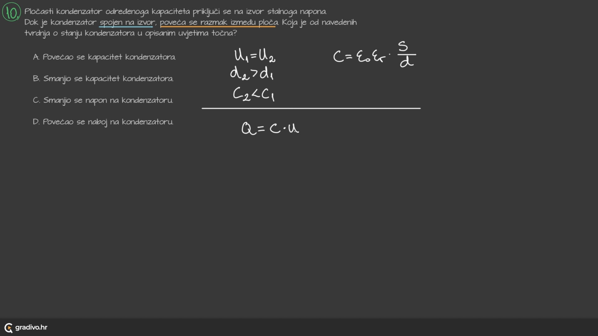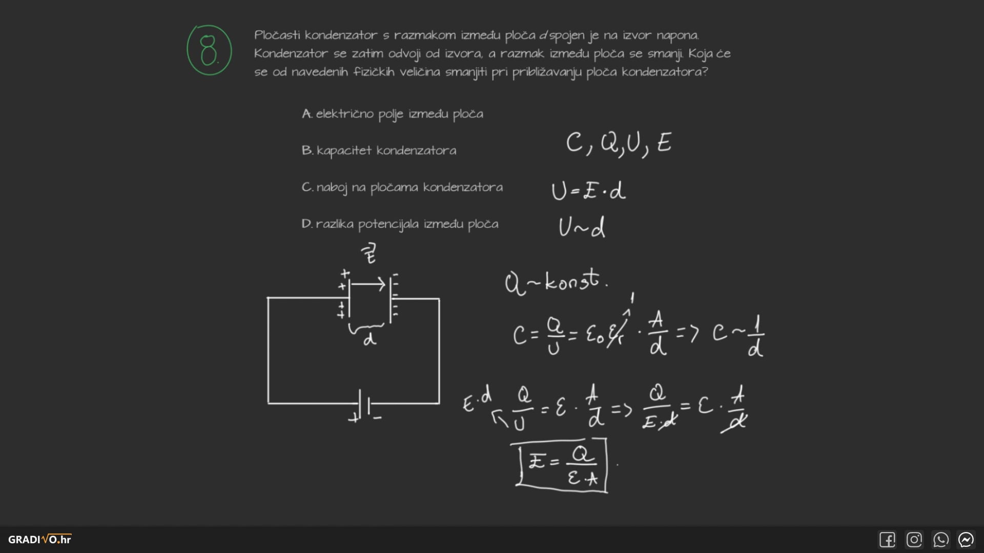 Ako je razlika potencijala (napon) između ploča jednak \(U\), a naboj na pločama \(Q\) tada je kapacitet jednak: