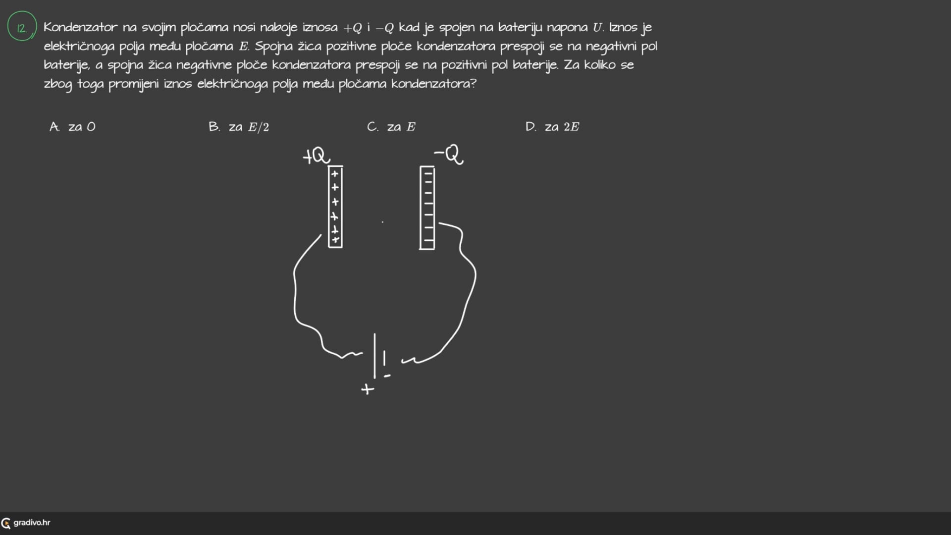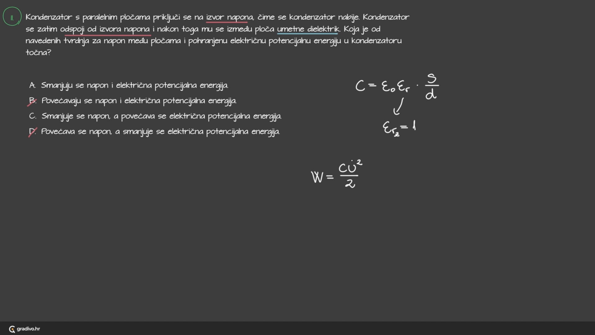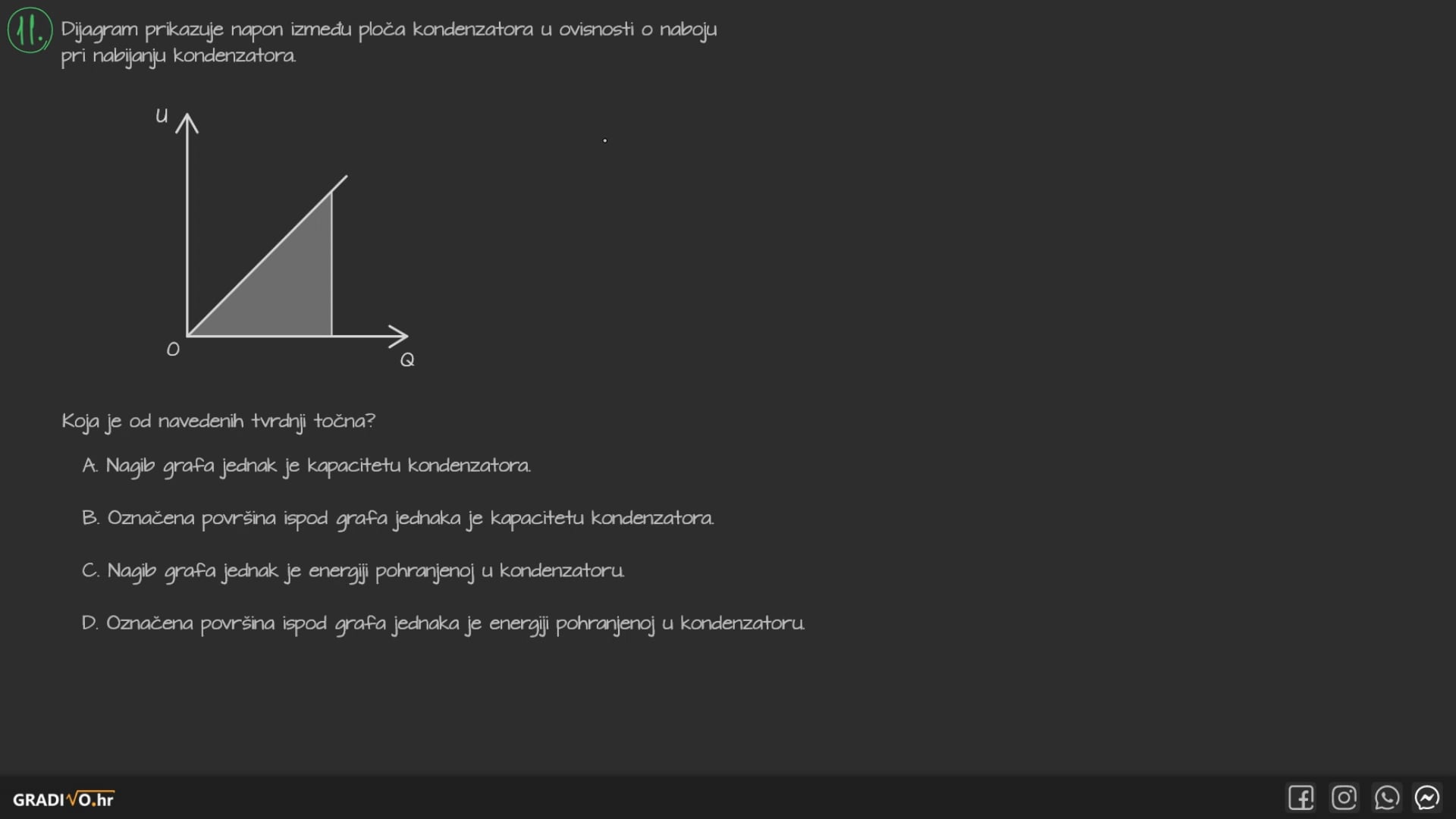 Da bismo kondenzator nabili nabojem \(Q\) potrebno je obaviti rad (dovesti energiju). Ta energija dolazi iz izvora napona \(U\) i po iznosu je jednaka: