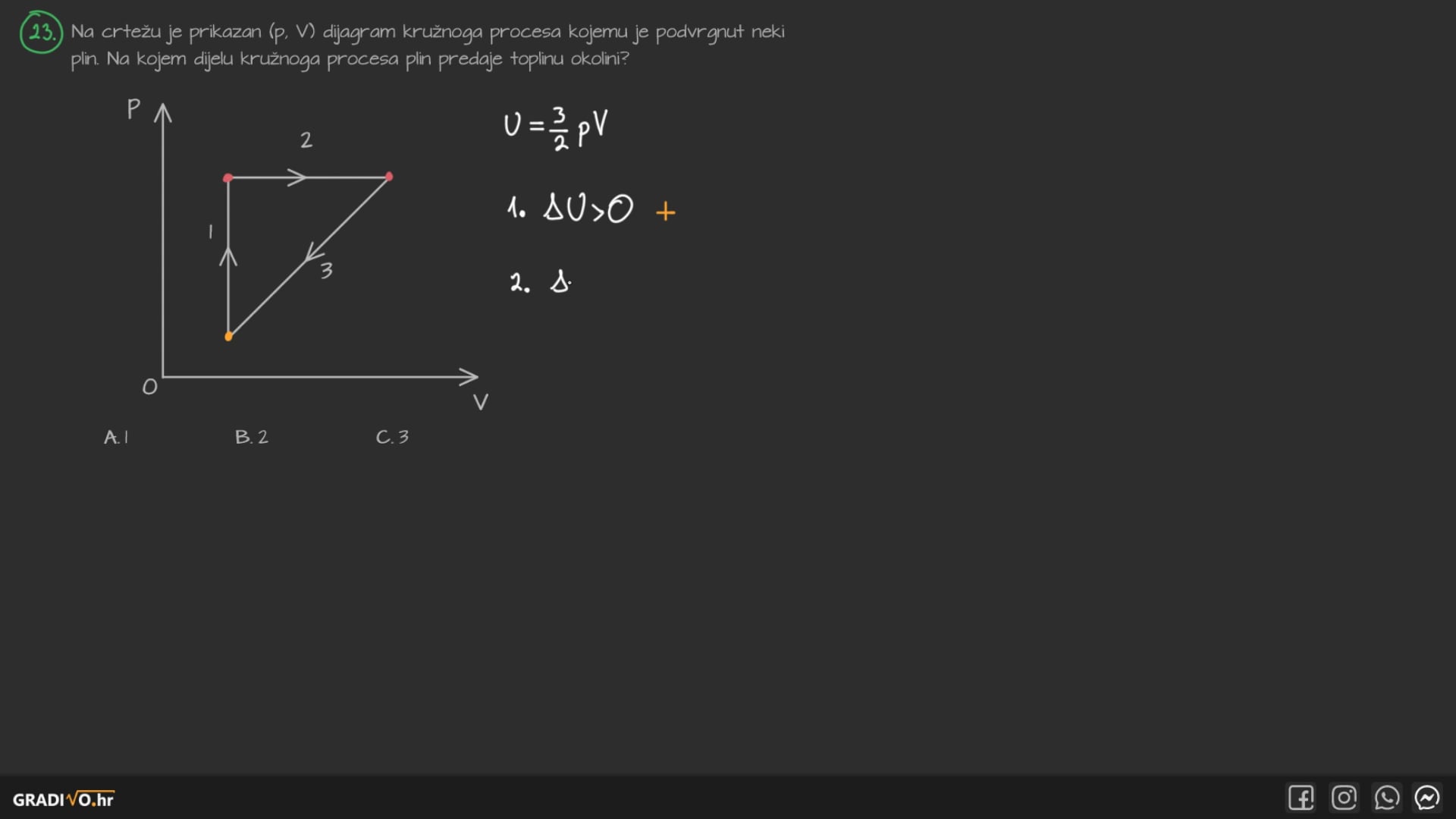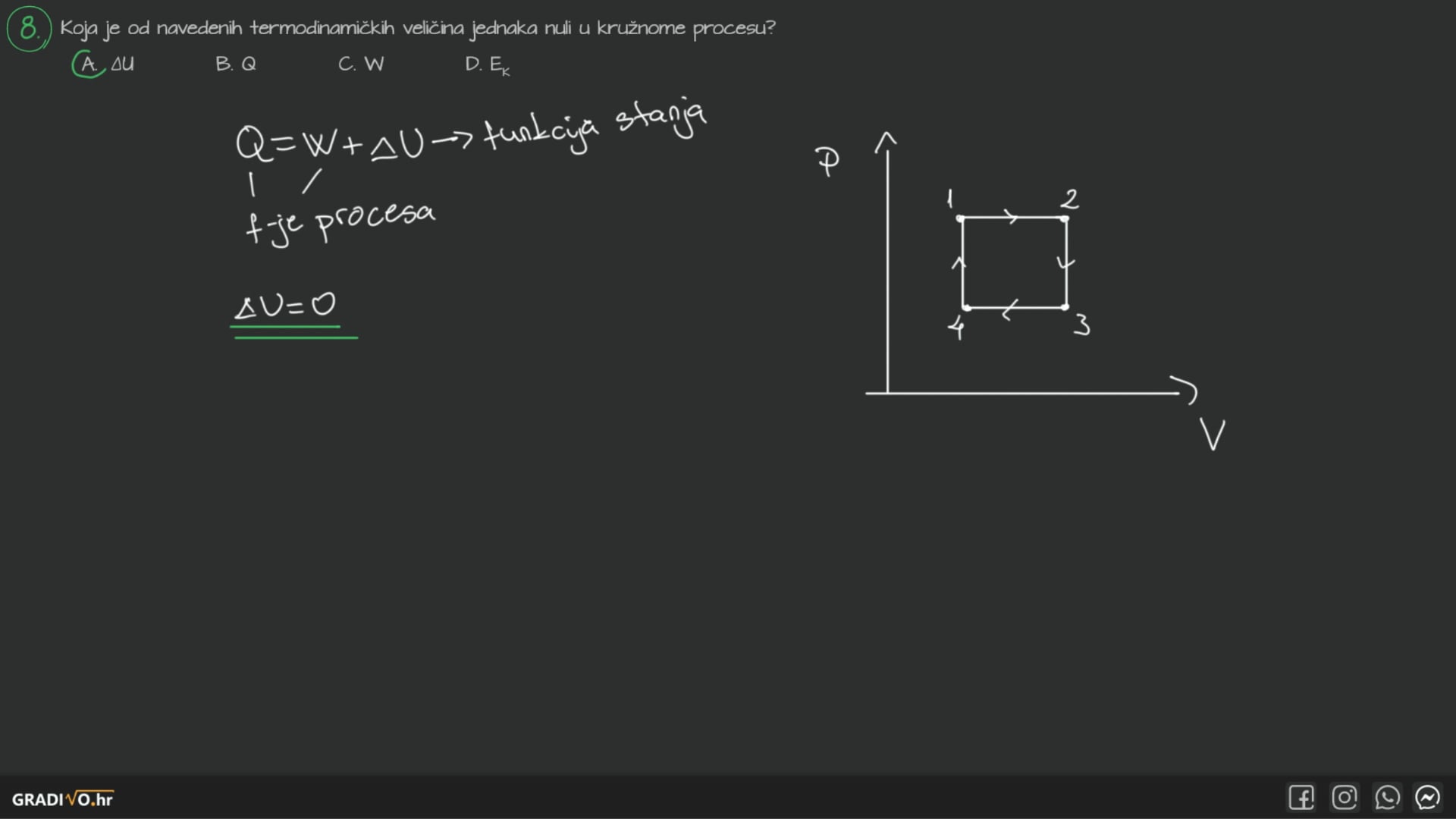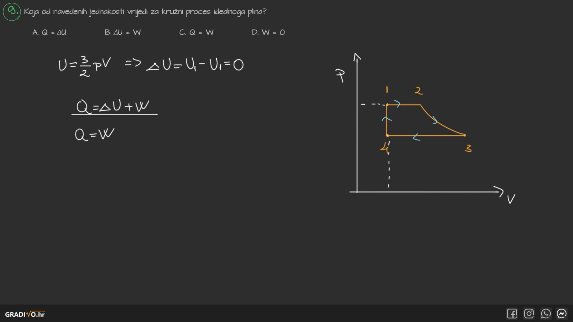U svakom kružnom procesu promjena unutarnje energije \(\Delta U\) je 0, što znači da će toplina biti jednaka obavljenom radu ako gledamo početnu i konačnu točku.