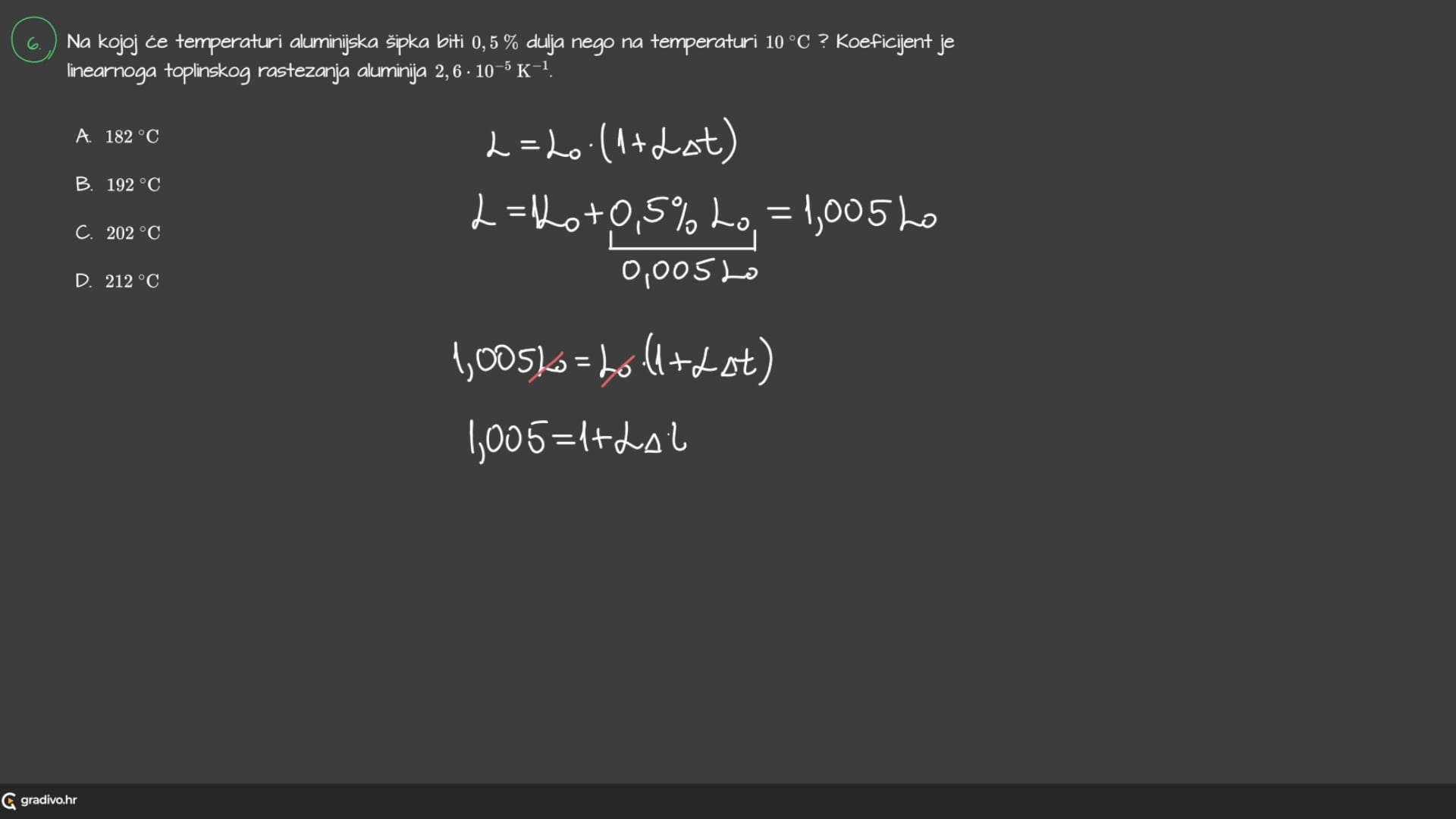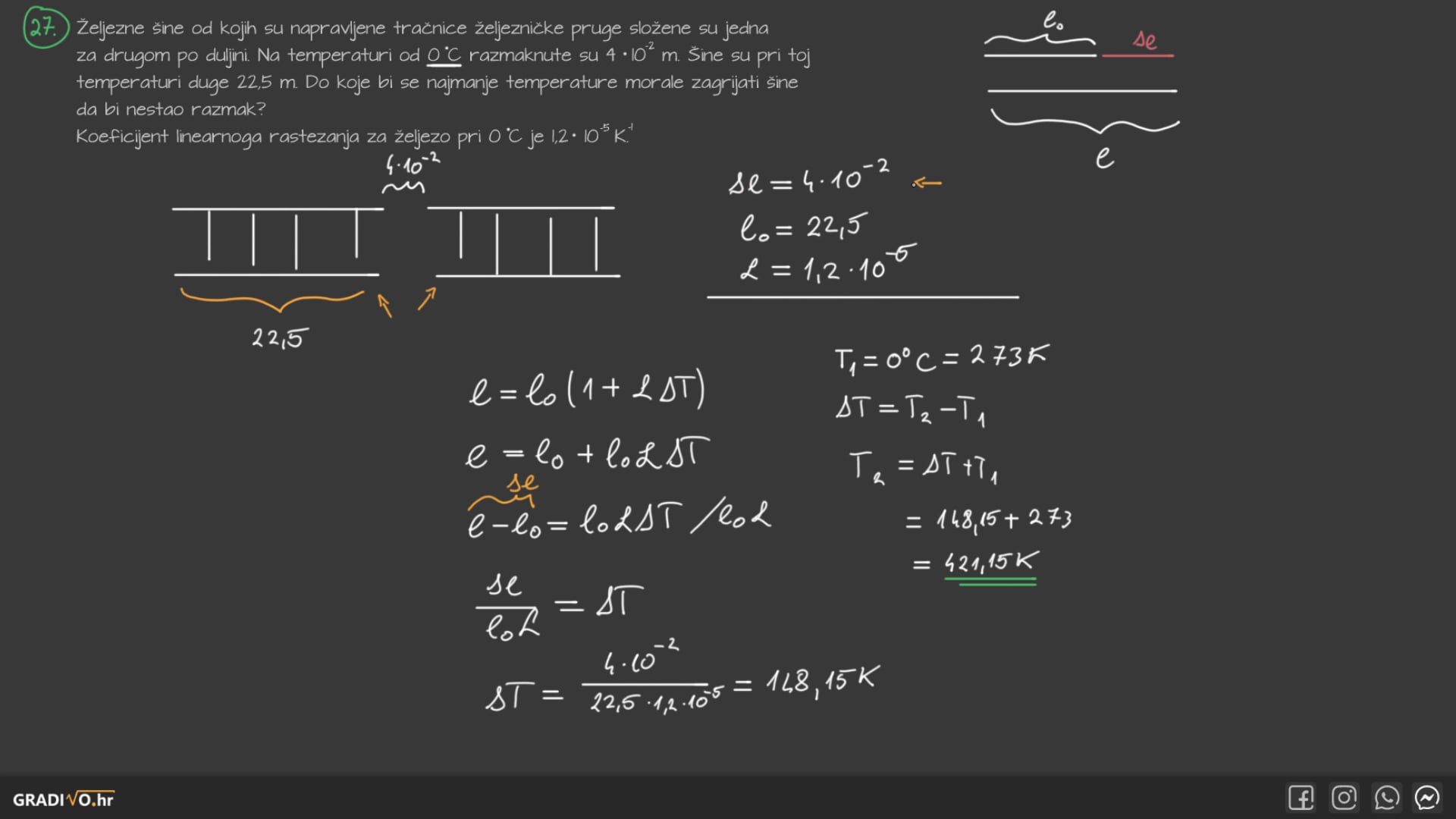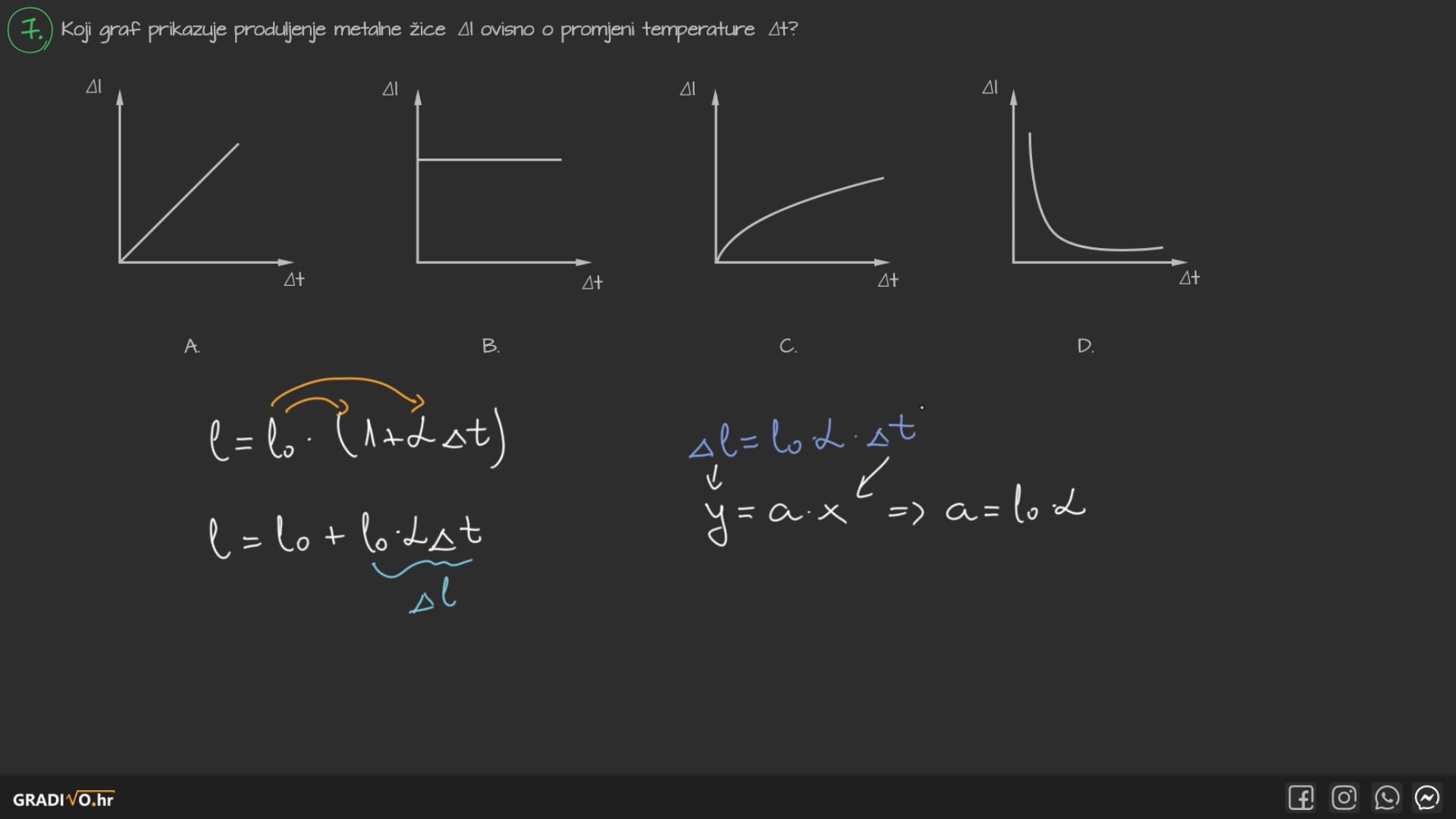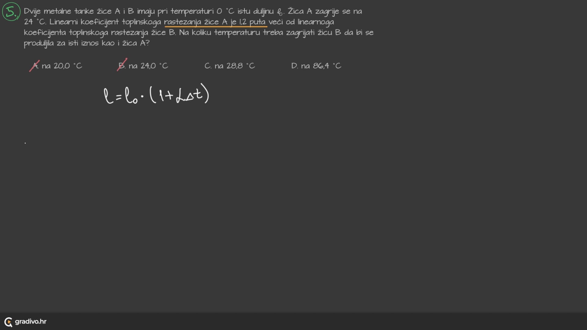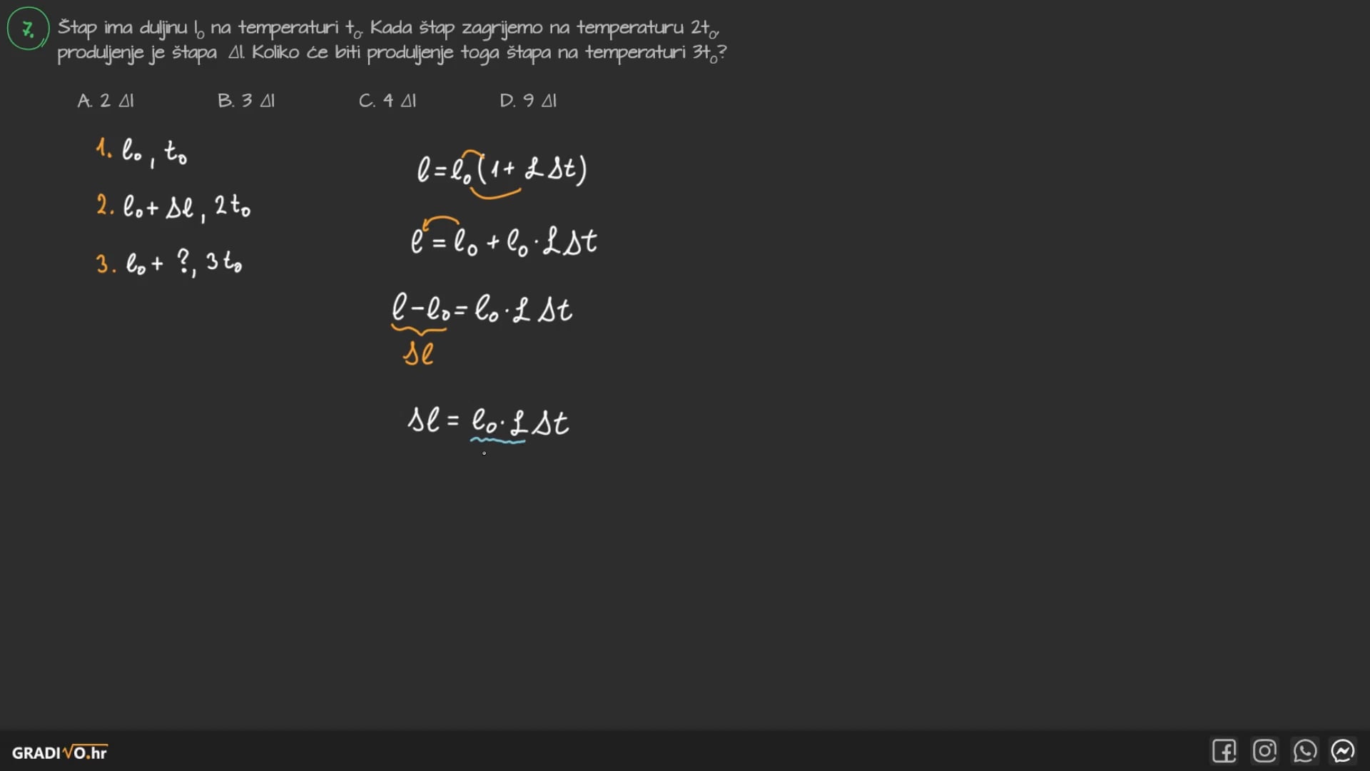 Kod linearnog širenja promatramo 1D objekt (štap, žica...). Početnu duljinu tvari koju promatramo označavamo \(l_0\), a konačnu duljinu (nakon širenja) označavamo s \(l\). \( \Delta T\) je povećanje temperature koje uzrokuje širenje.