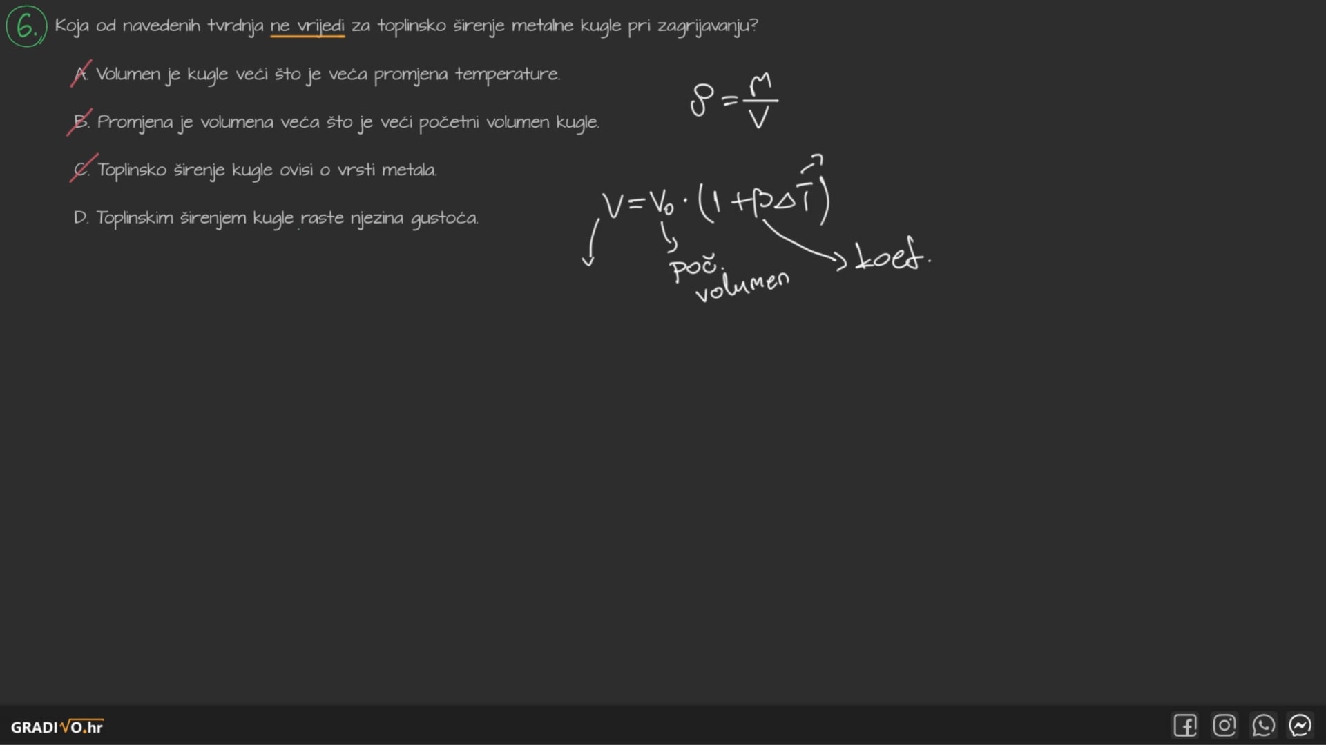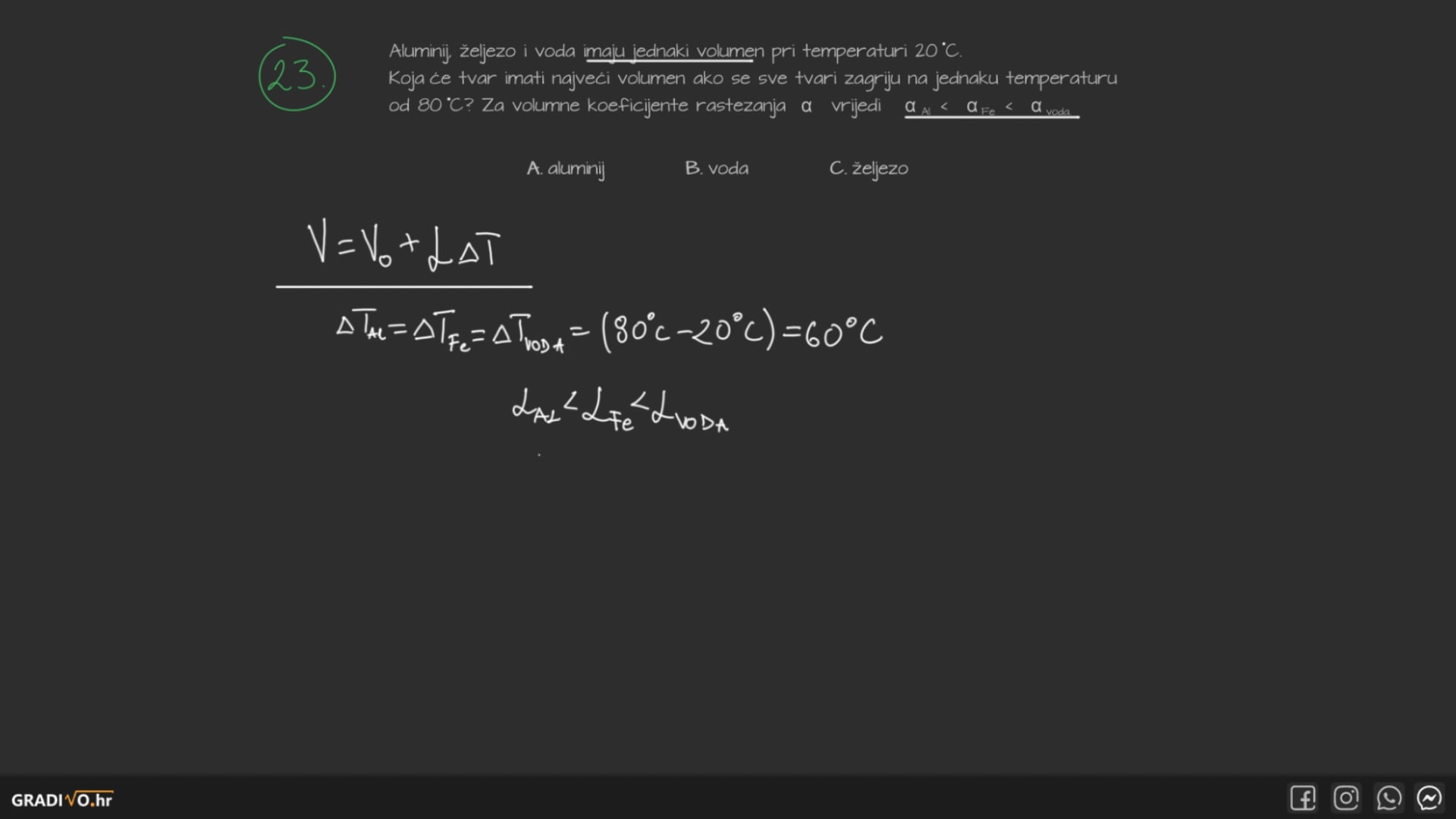 Kod volumnog širenja promatramo širenje u 3 dimenzije (promjenu volumena). Početni volumen označavamo \(V_0\), a konačni s \(V\). \(\Delta T\) je povećanje temperature koje uzrokuje širenje. Trodimenzionalnu promjenu možemo smatrati kao trostruku jednodimenzionalnu promjenu, tj. linearno širenje u tri dimenzije pa je veza između temperaturnih koeficijenata: