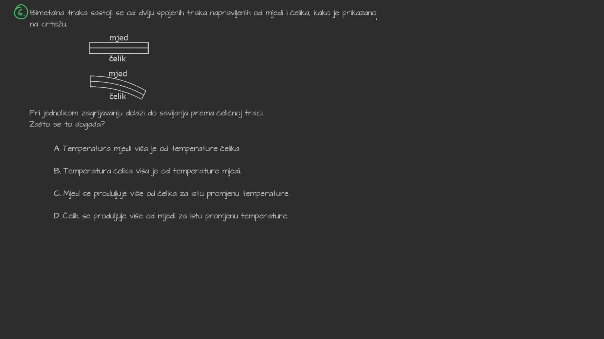 Na slici je prikazan primjer zagrijavanja bimetalne trake. Možemo vidjeti da metal A ima veći koeficijent linearnog toplinskog širenja jer se pri zagrijavanju njegova duljina poveća za veći iznos i on time postaje vanjski metal savijene trake.
