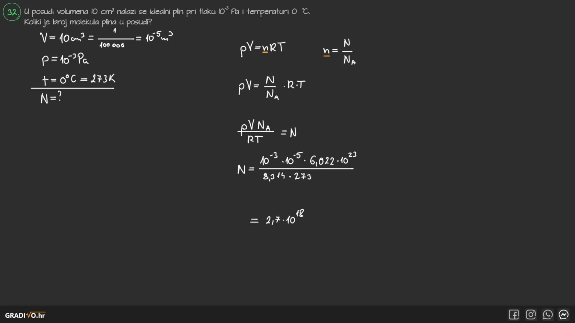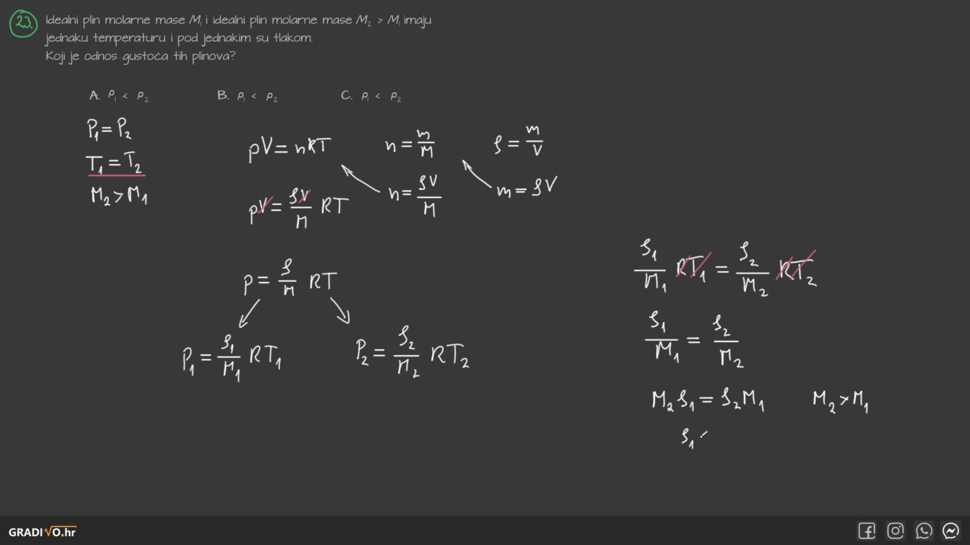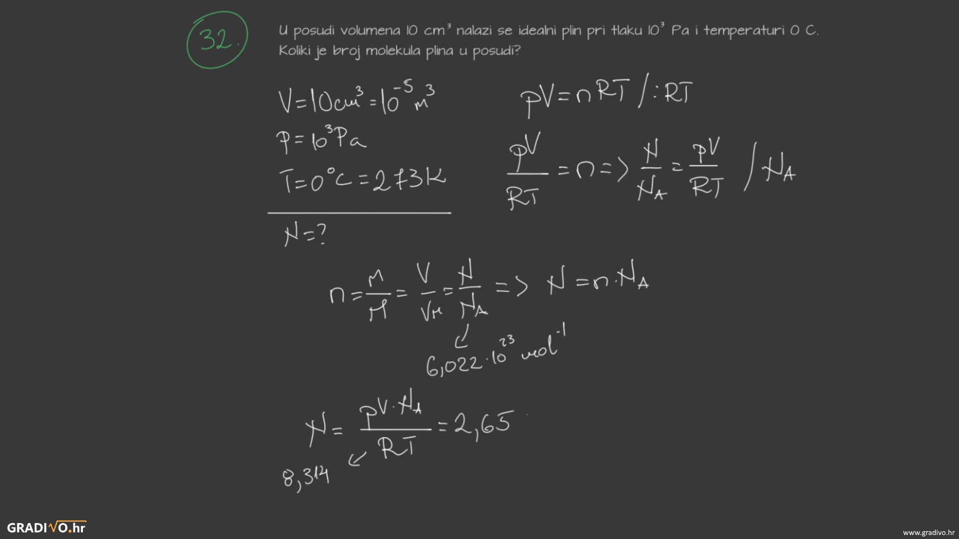 Prvi omjer je omjer broja molekula ili atoma plina \(N\) i Avogadrovog broja \(N_A = 6.022 \cdot 10^{23} \mathrm{mol^{-1}}\). Drugi omjer je omjer mase plina \(m\) i molarne mase \(M\).