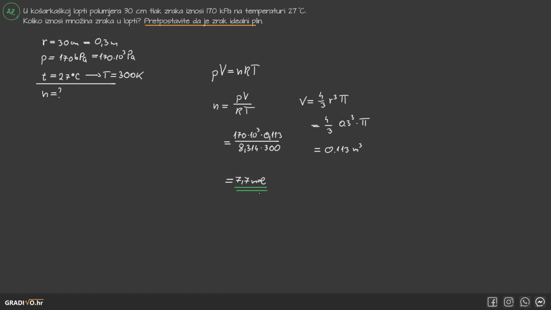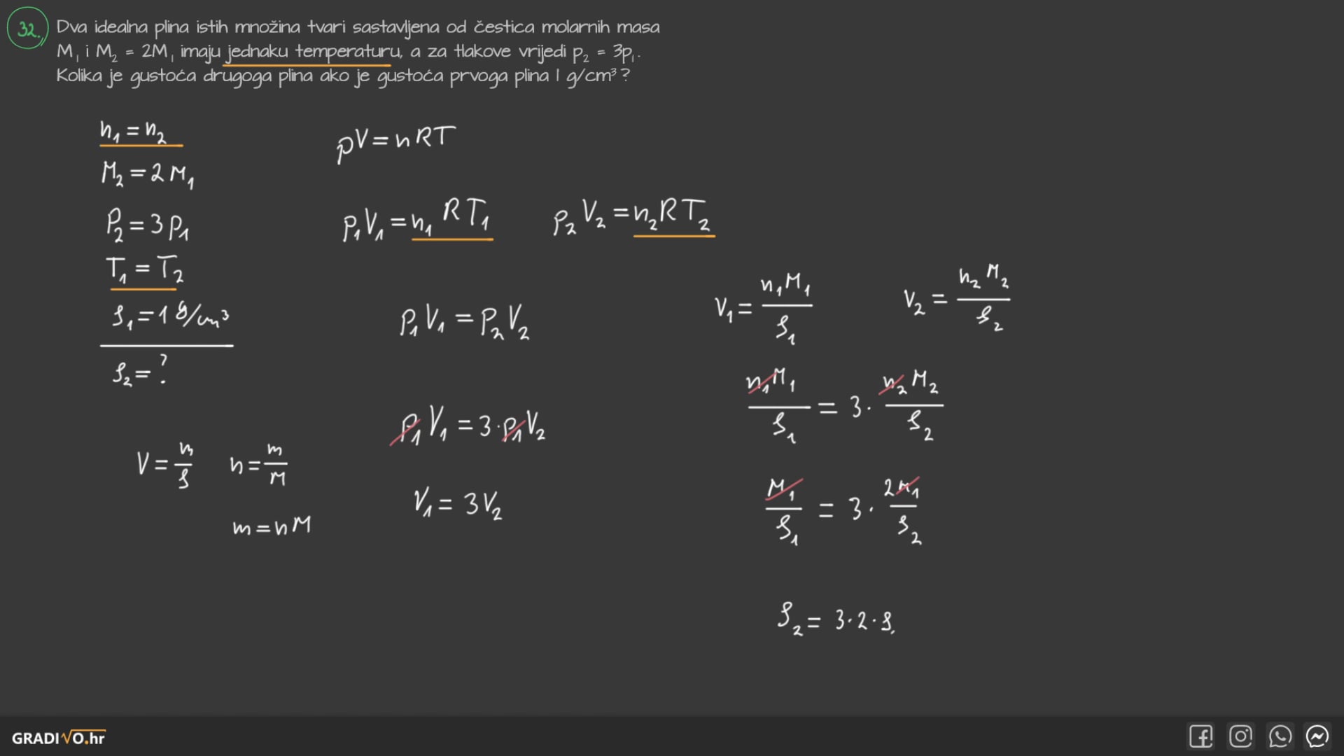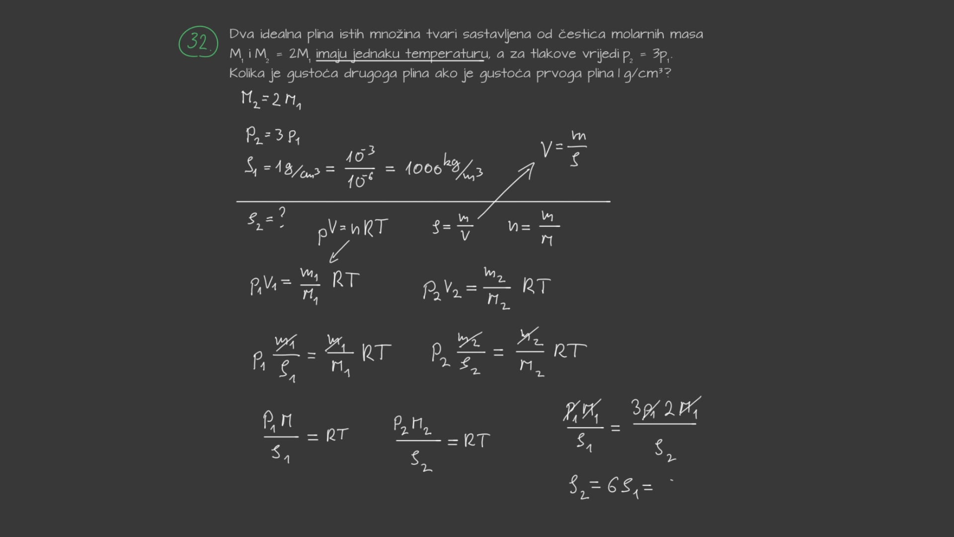 Prvi omjer je omjer broja molekula ili atoma plina \(N\) i Avogadrovog broja \(N_A = 6.022 \cdot 10^{23} \mathrm{mol^{-1}}\). Drugi omjer je omjer mase plina \(m\) i molarne mase \(M\).