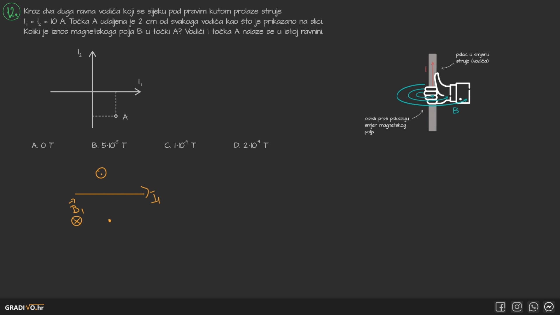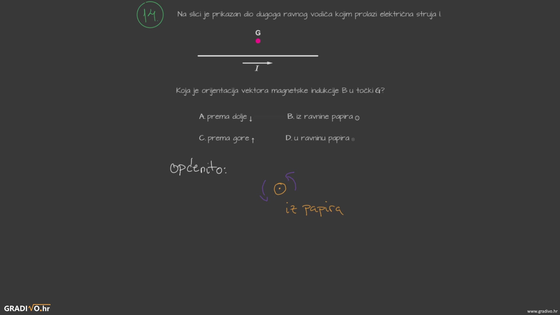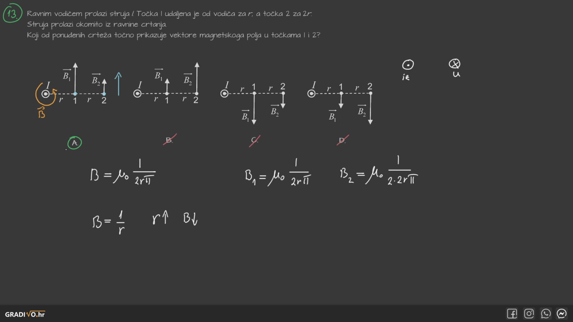Ravni vodič kojim teče struja \(I\) stvara oko sebe magnetsko polje indukcije \(B\). Jakost tog magnetskog polja opada udaljavanjem od toga vodiča i računamo ga po formuli: