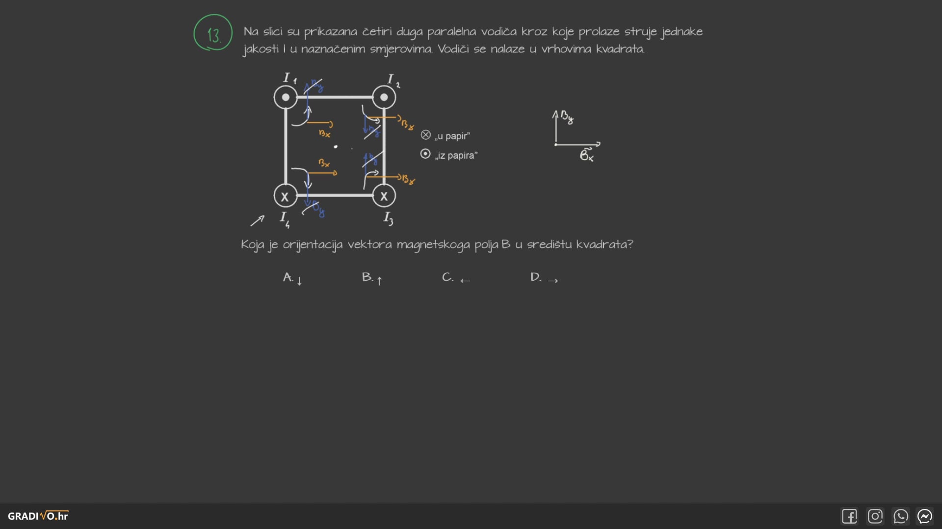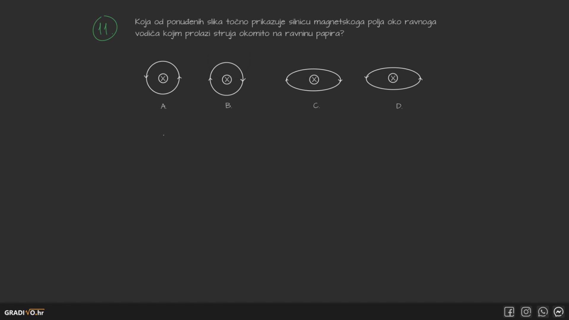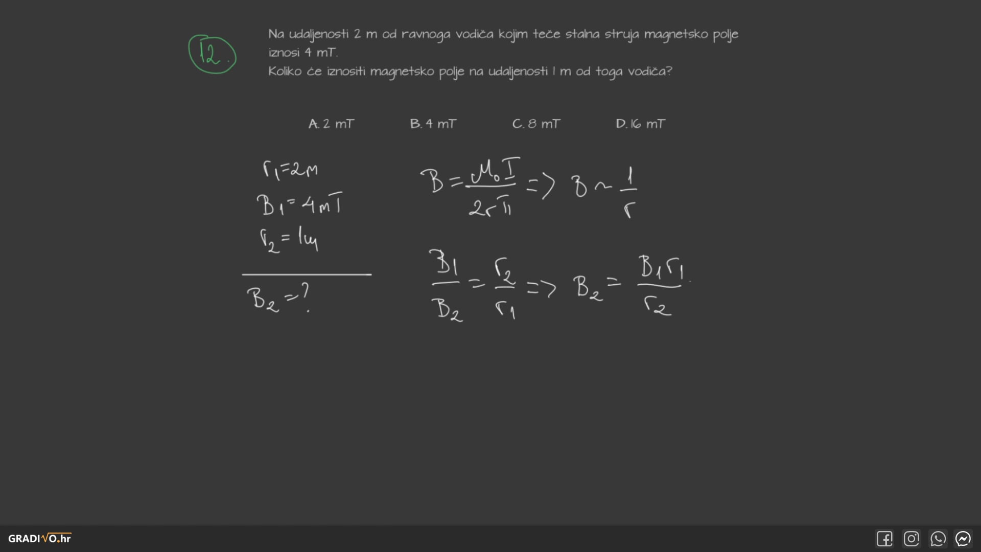 Ravni vodič kojim teče struja \(I\) stvara oko sebe magnetsko polje indukcije \(B\). Jakost tog magnetskog polja opada udaljavanjem od toga vodiča i računamo ga po formuli: