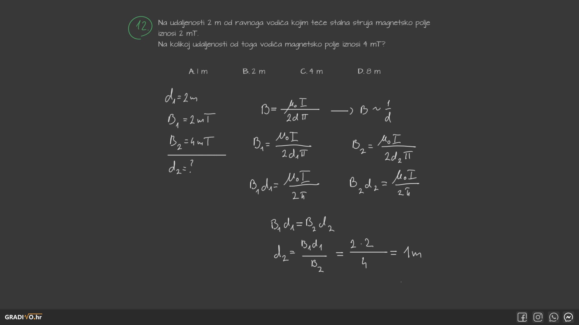 Udaljenost od vodiča označavamo s \(r\), dok je \( (\mu_0 = 4\pi \cdot 10^{-7}\)) konstanta koju nazivamo magnetska permeabilnost vakuuma. Kada se vodič nalazi u nekom sredstvu onda magnetsku permeabilnost vakuuma moramo pomnožiti s relativnom permeabilnosti sredstva \(\mu_r\). Relativna permeabilnost za vakuum iznosi 1.