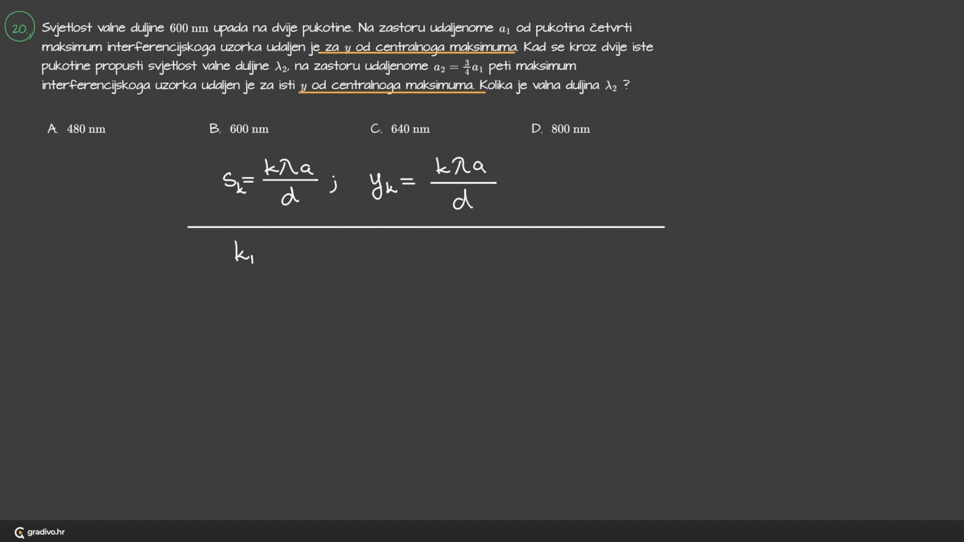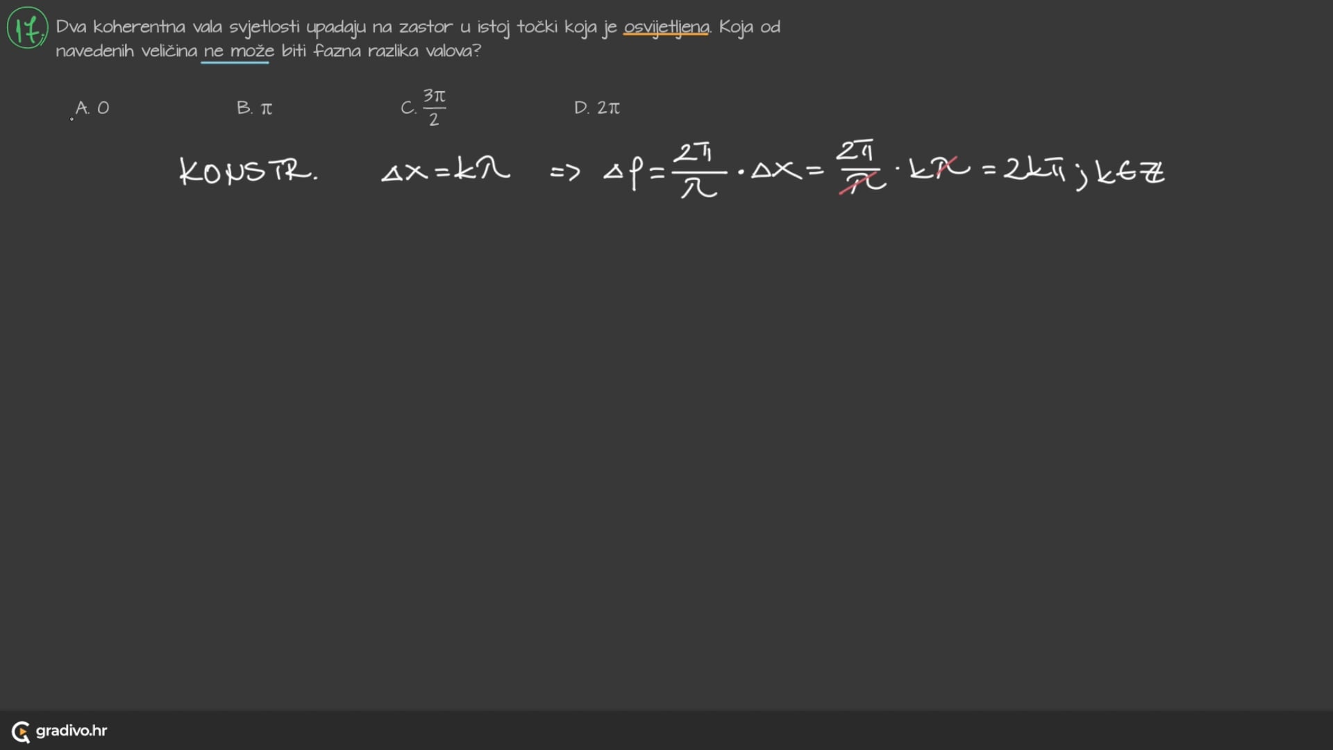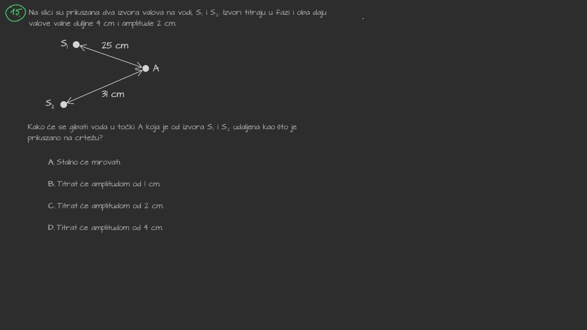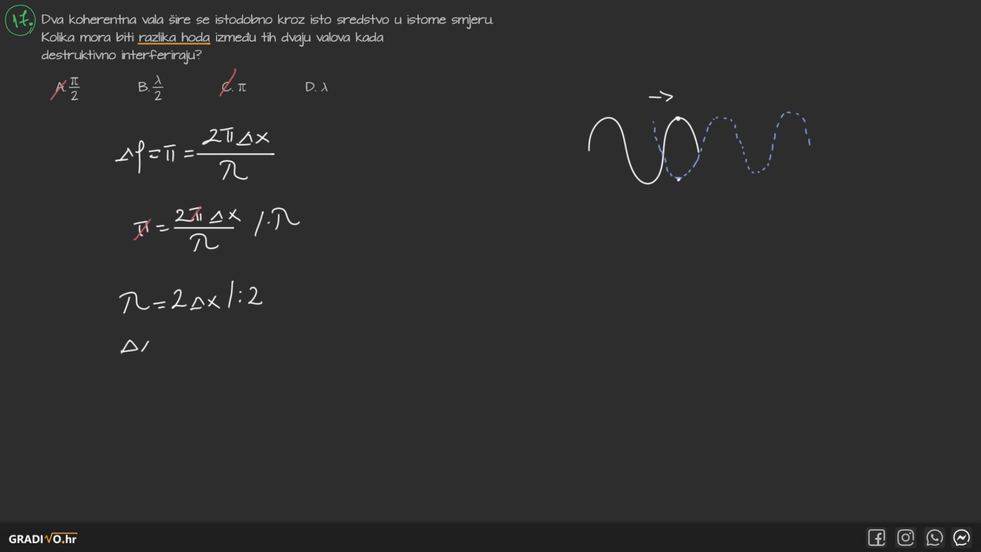 Na slici je vidljivo da je razlika u hodu dvaju valova jednaka \(3\frac{\lambda}{2}\) što znači da će u toj točki doći do destruktivne interferencije.