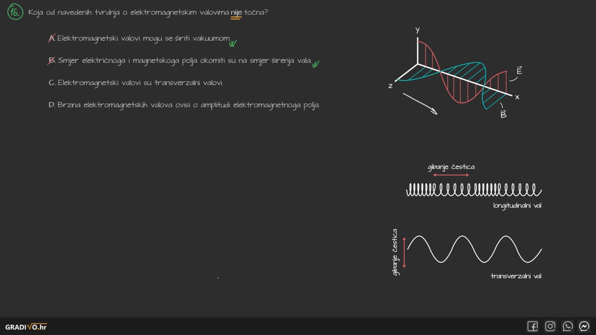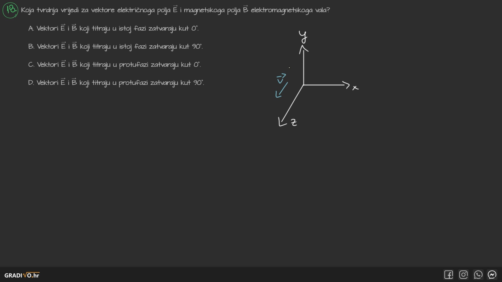 Magnetsko polje titra u smjeru z-osi, električno polje u smjeru y-osi, a val se širi (propagira) u smjeru x-osi.