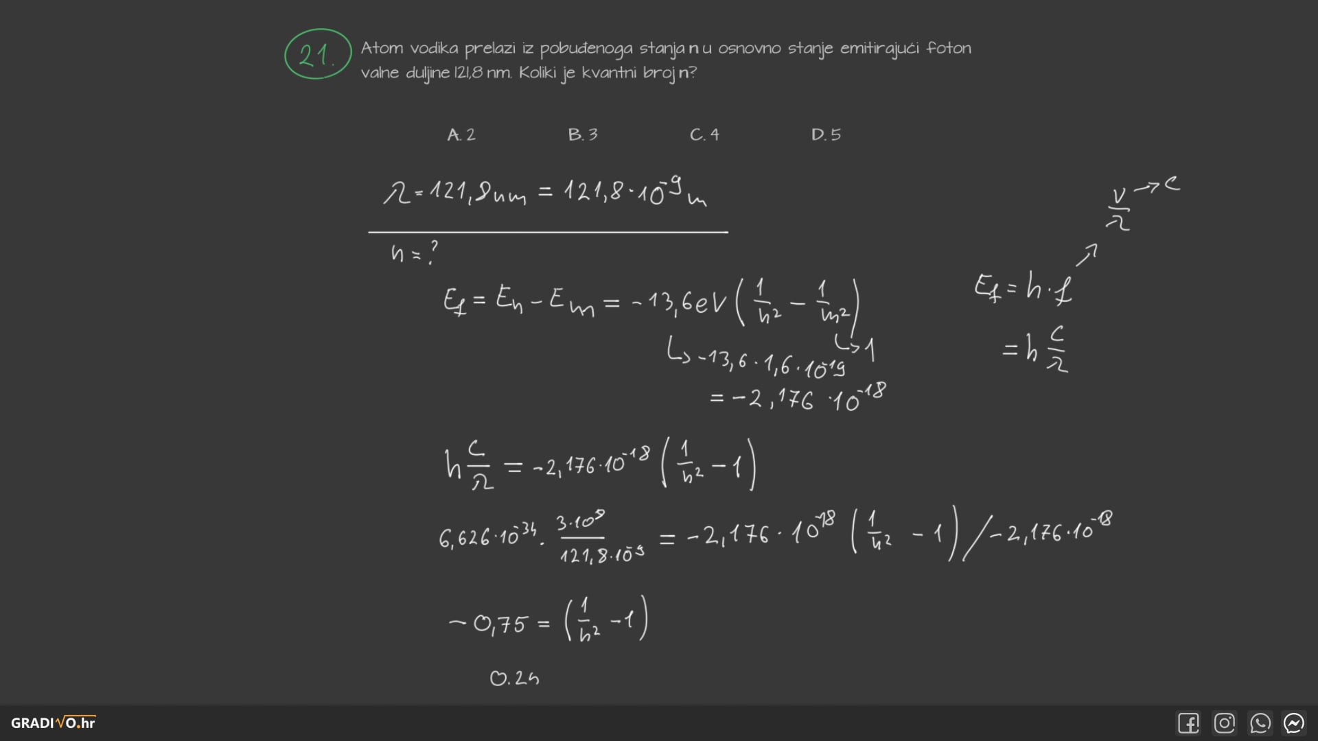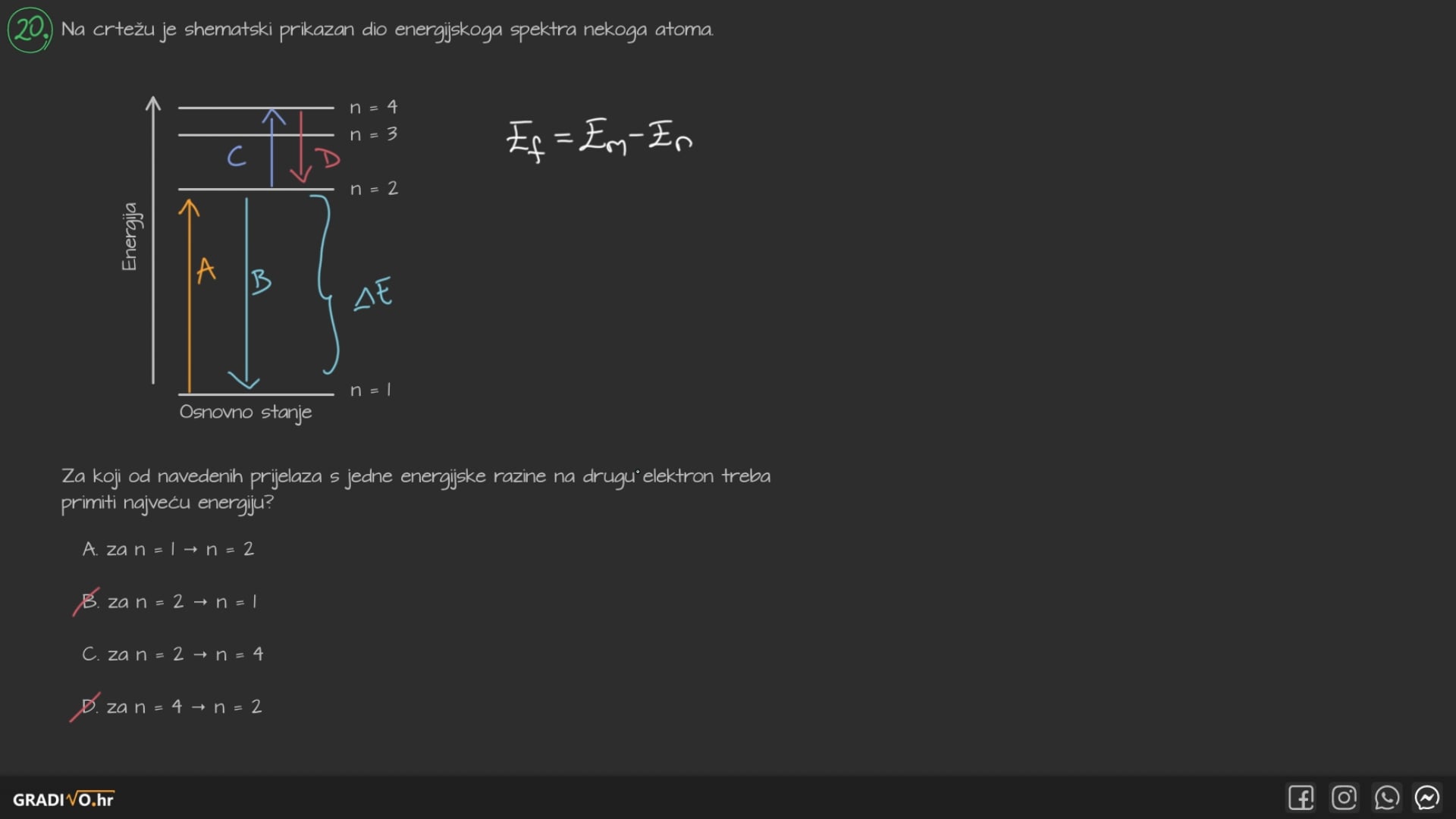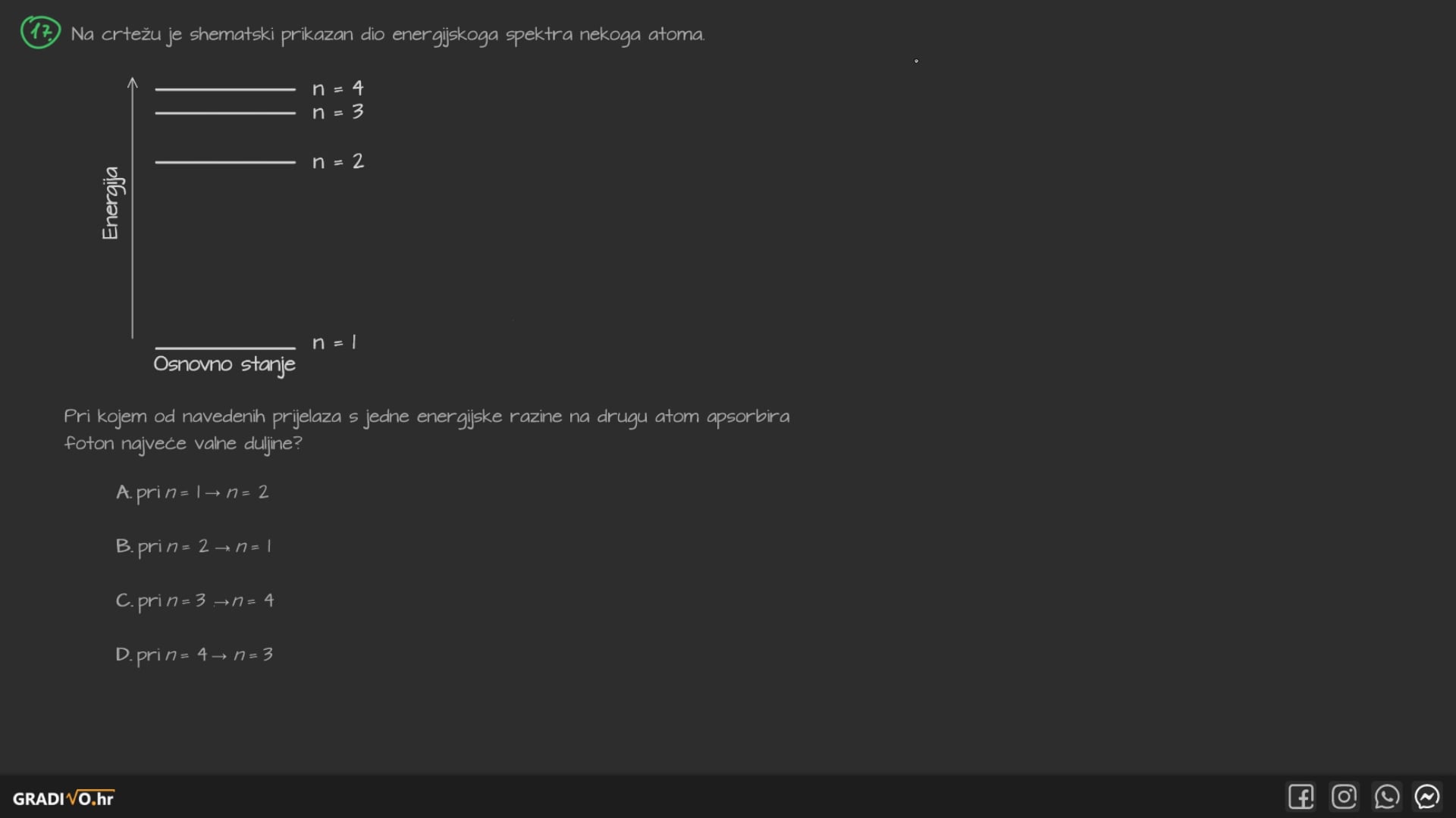 Svako stacionarno stanje karakterizira točno određena (diskretna) vrijednost energije i kvantni broj \(n\). Elektron iz jednog u drugo stacionarno stanje može prijeći samo emisijom ili apsorpcijom energije čija je vrijednost jednaka razlici energija početnog i konačnog stacionarnog stanja. Apsorbiranu i emitiranu energiju prikazujemo pomoću elektromagnetskog zračenja - fotona (\(E_f = hf\)). Kod vodikovog atoma ta je energija jednaka: