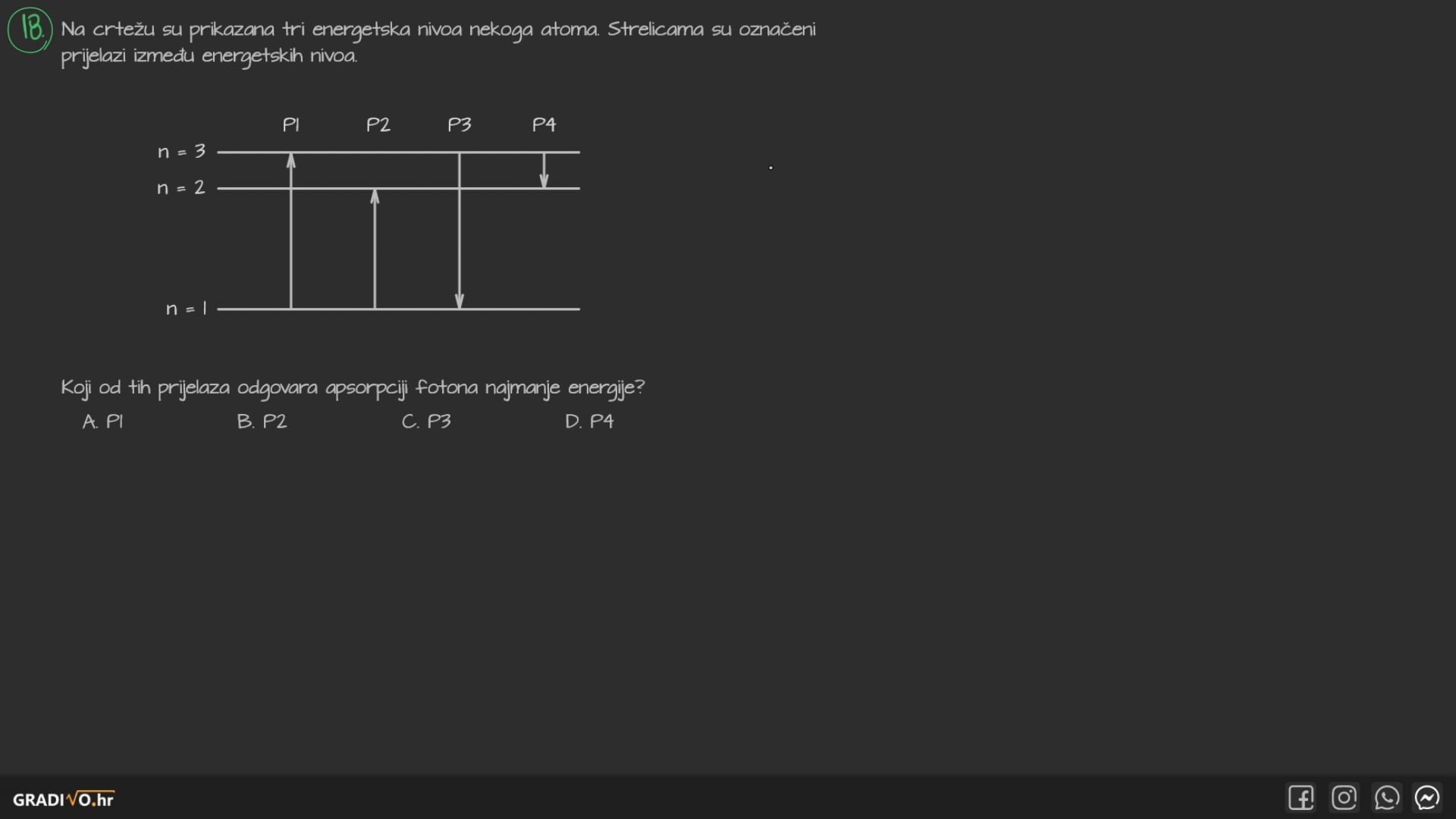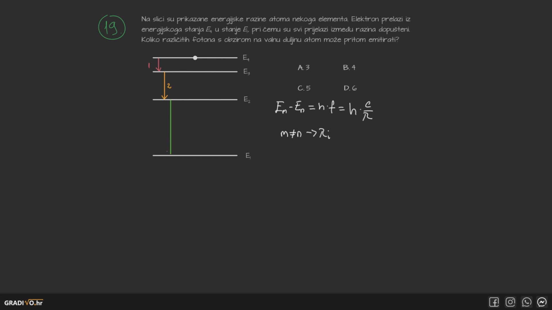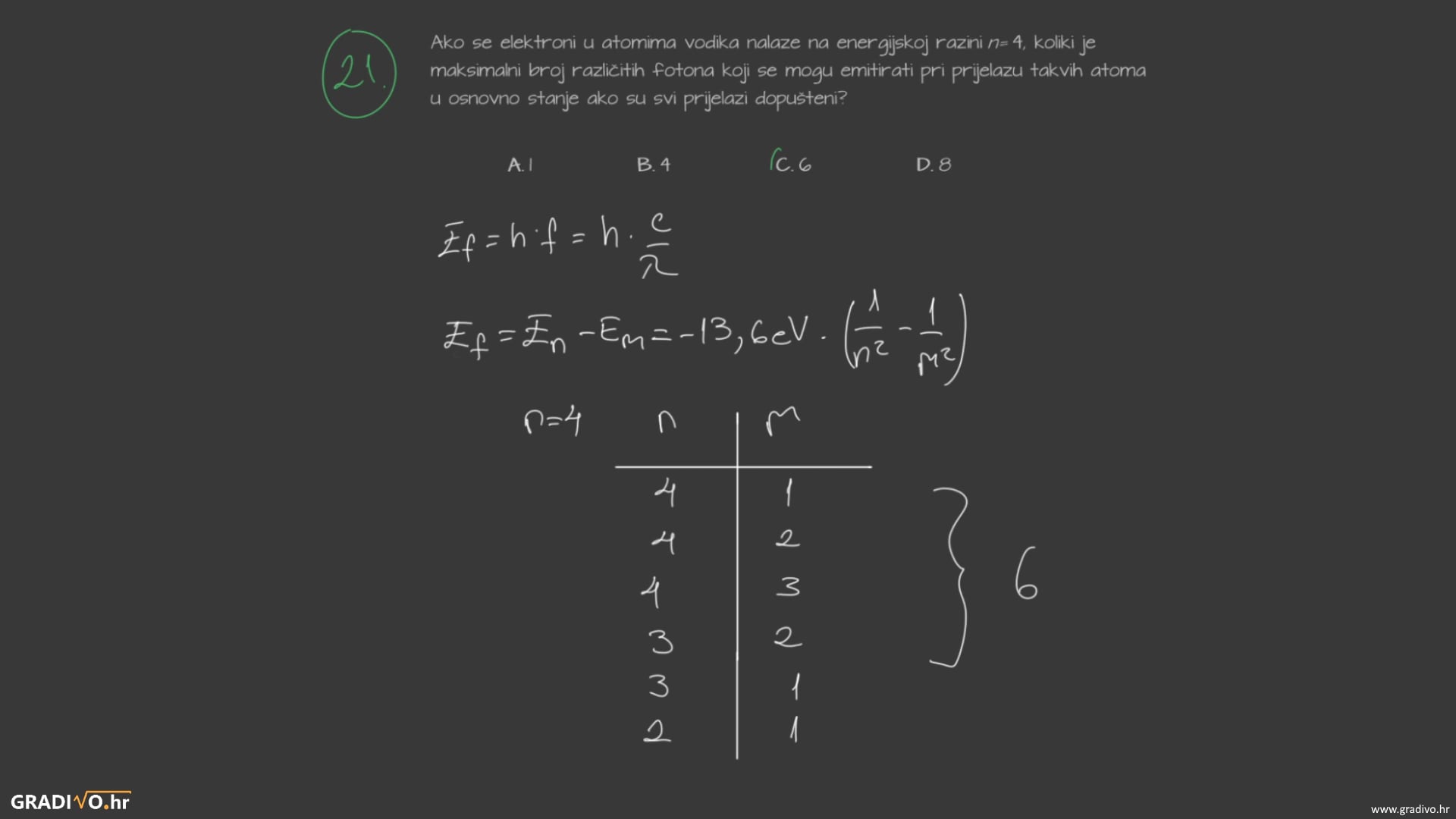 Svako stacionarno stanje karakterizira točno određena (diskretna) vrijednost energije i kvantni broj \(n\). Elektron iz jednog u drugo stacionarno stanje može prijeći samo emisijom ili apsorpcijom energije čija je vrijednost jednaka razlici energija početnog i konačnog stacionarnog stanja. Apsorbiranu i emitiranu energiju prikazujemo pomoću elektromagnetskog zračenja - fotona (\(E_f = hf\)). Kod vodikovog atoma ta je energija jednaka:
