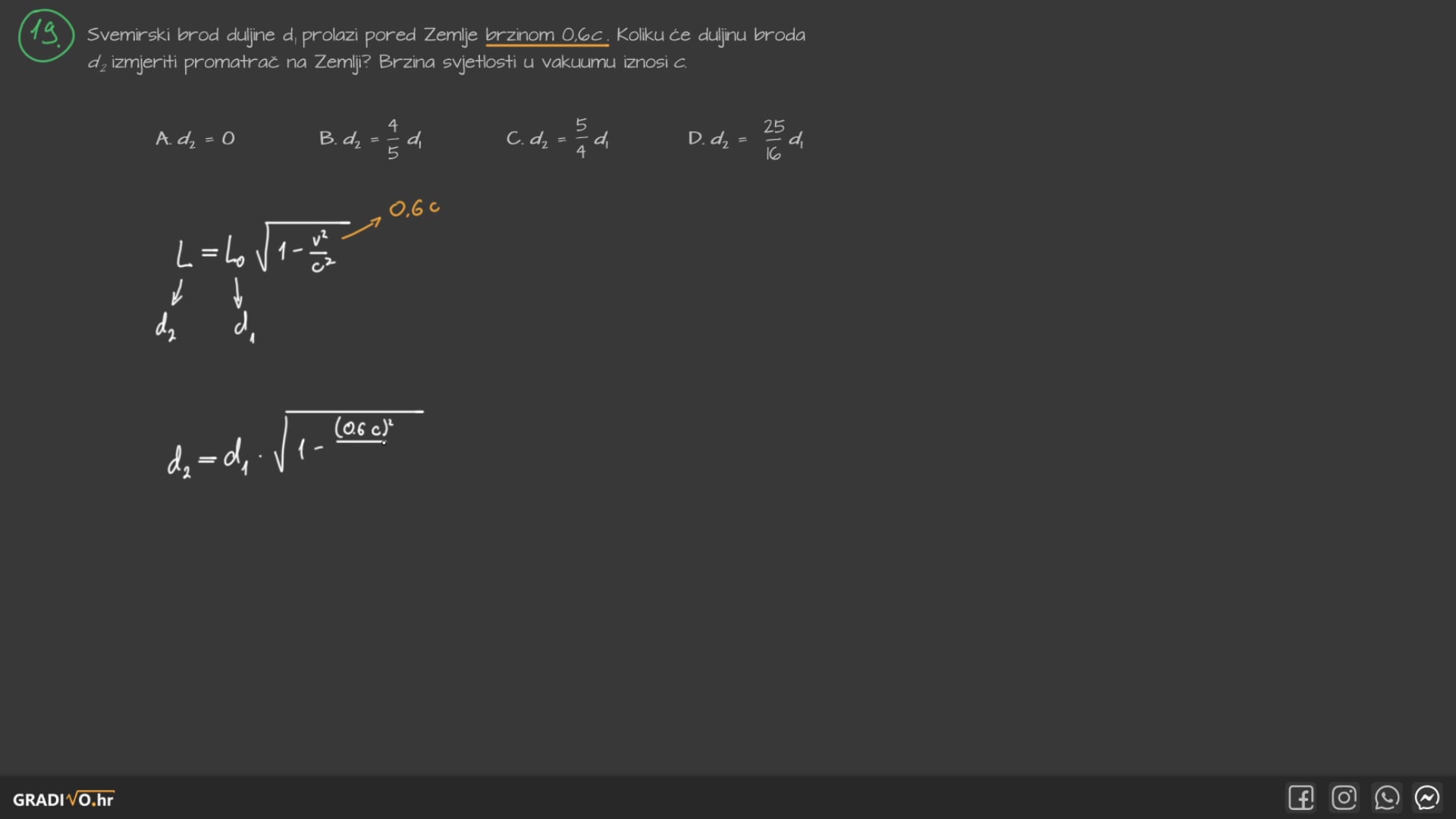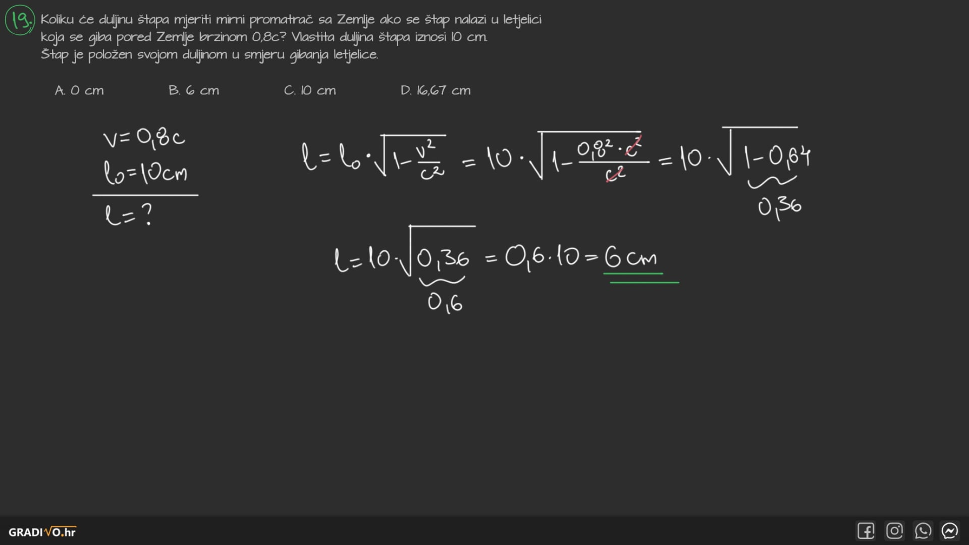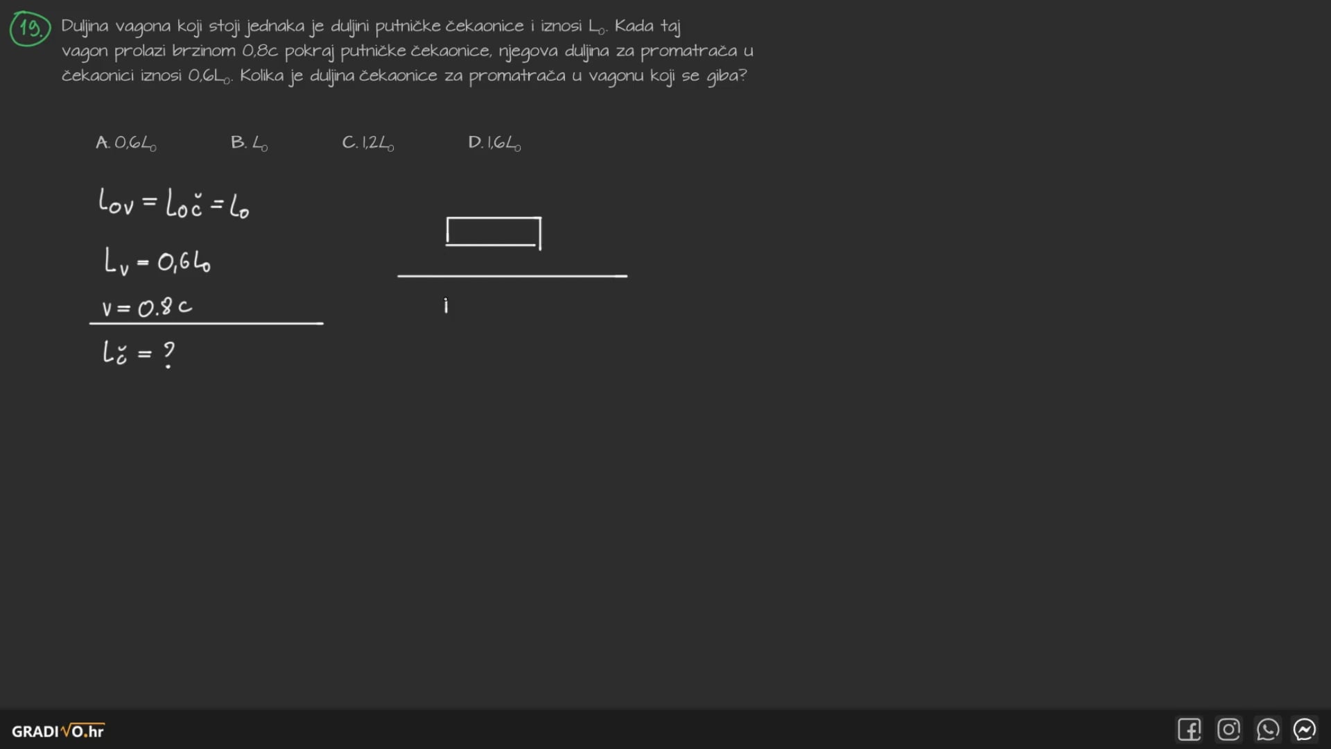 Stvarna duljina nekog objekta mjerena u referentnom sustavu iznosi \(l_0\). Kada se taj sustav giba velikom brzinom \(v\), promatraču u drugom sustavu se ista duljina čini kraćom. Duljinu koju vidi promatrač označavamo s \(l\) i računamo ju po formuli: