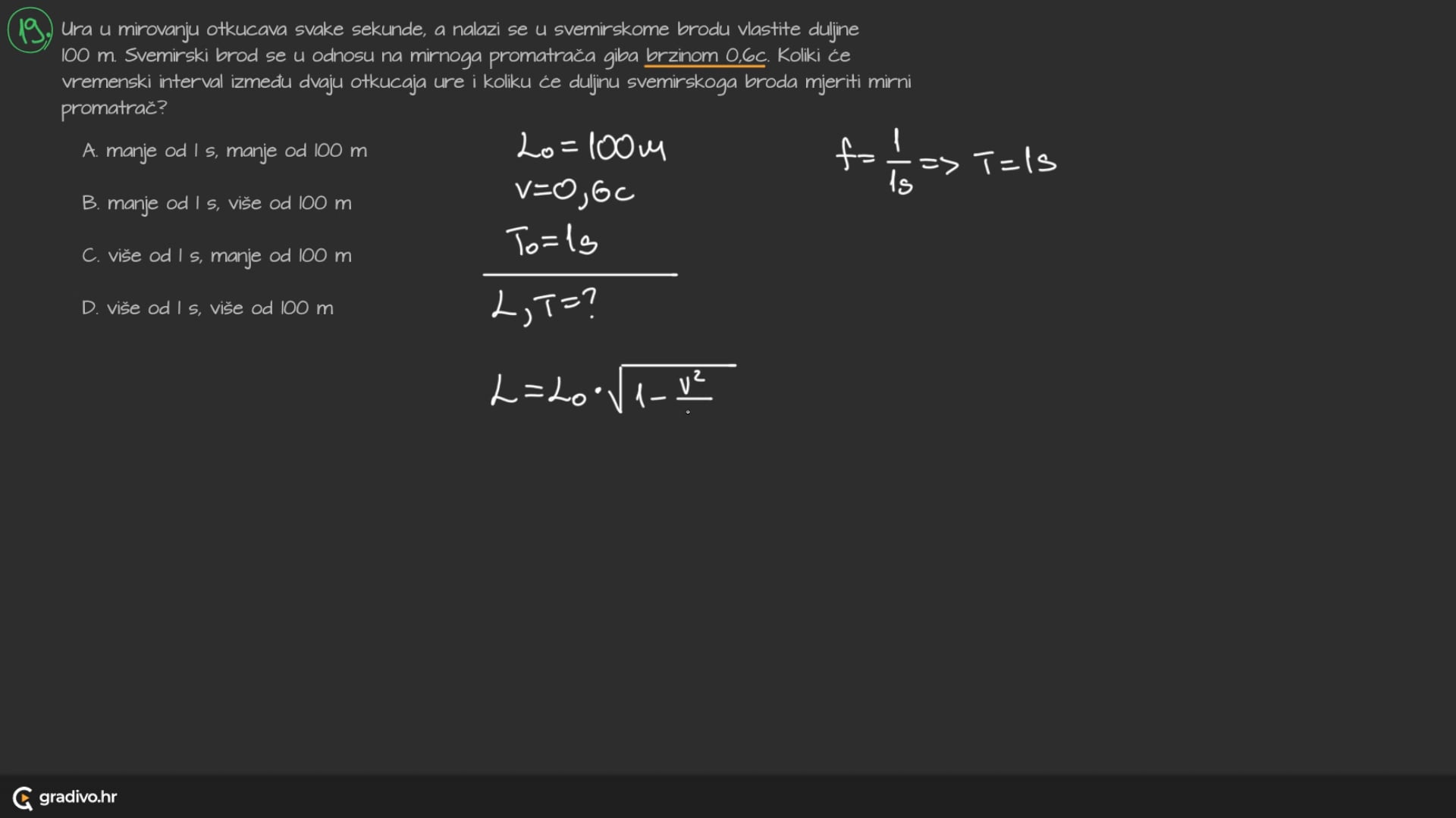 Vrijeme koje mjeri promatrač na Zemlji \(T\) ili \(\Delta t\) , veće je od vremena koje mjerimo u referentnom sustavu \(T_0\) ili \(\Delta t_0\). Odnos tih vremena opisujemo izrazom: