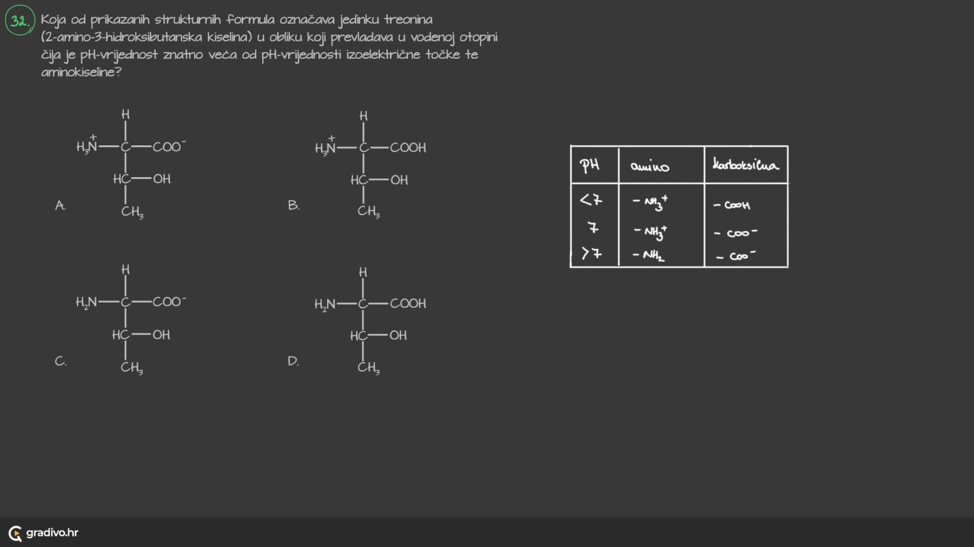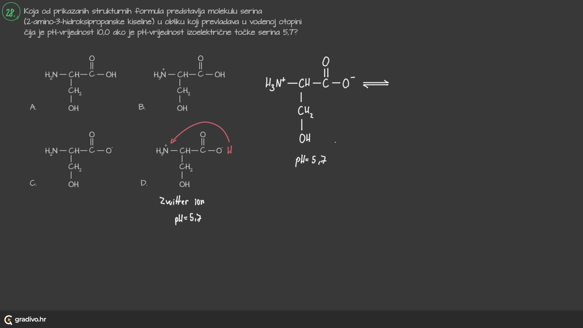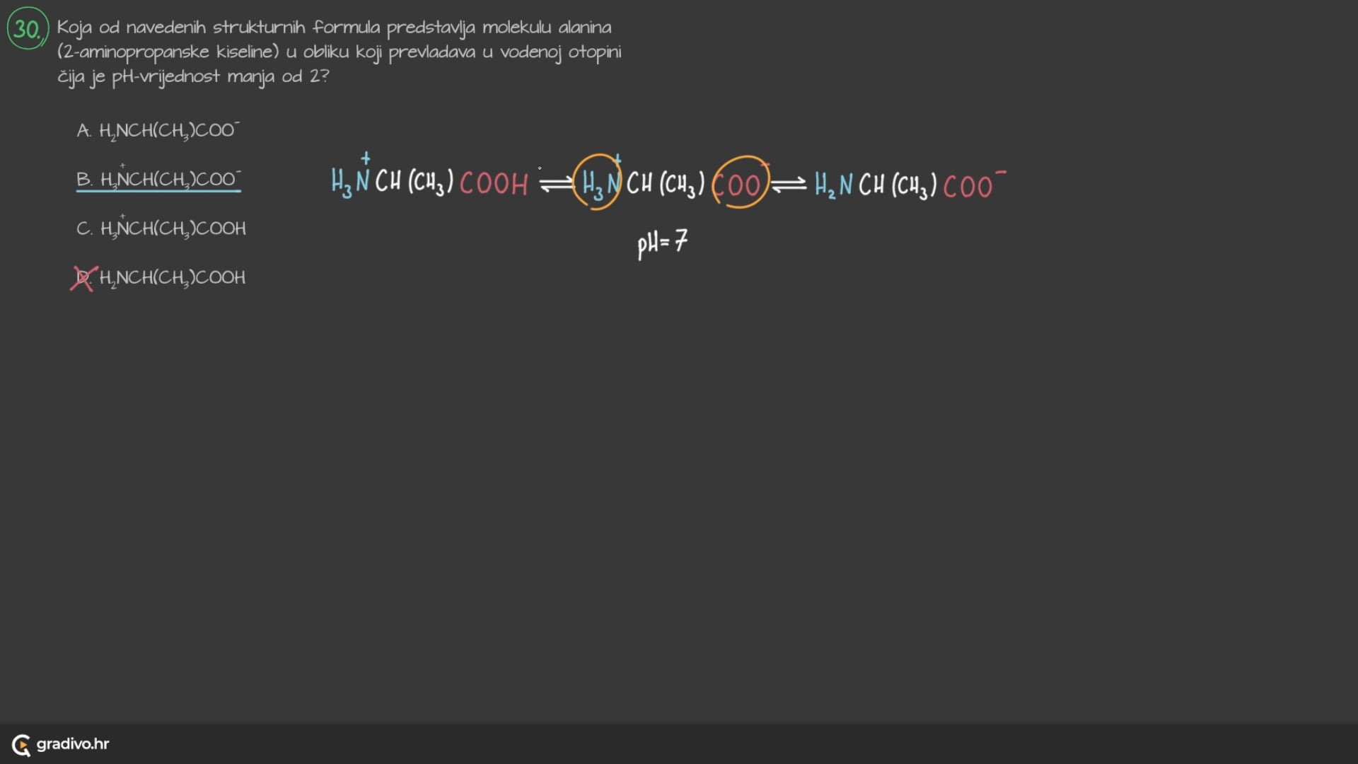 U vodenim otopinama aminokiselina zbiva se kiselo-bazna reakcija. Prevladavajući oblik molekule aminokiseline ovisi o pH-vrijednosti otopine. Tako će u jako kiseloj vodenoj otopini amino-skupina molekule aminokiseline je protonirana i pozitivno nabijena, a u jako lužnatoj vodenoj otopini karboksilna skupina molekula aminokiseline negativno je nabijena. pH vrijednost vodene otopine aminokiselina odgovarat će vrijednosti izoelektrične točke. U toj točki molekula je prisutna u obliku dipolarnog iona koji se još naziva i zwitterion.
