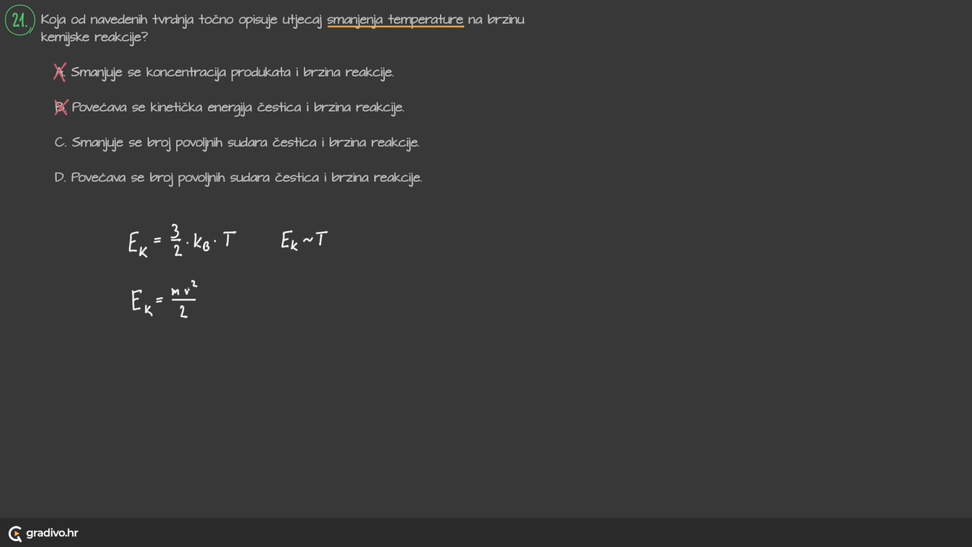 Grafički prikaz ovisnosti broja molekula i kinetičkih energija pri nižoj i višoj temperaturi pokazuje kako je reakcija brža pri višoj temperaturi zbog većeg broja povoljnih sudara.