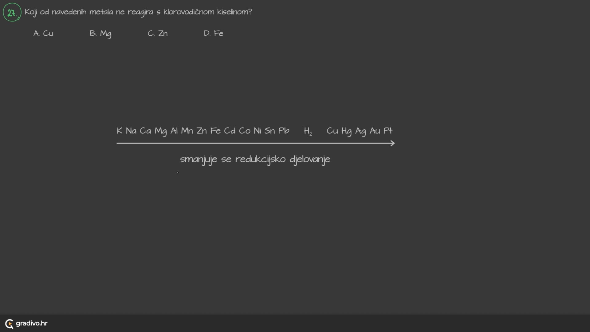 Metali koji reagiraju s klorovodičnom kiselinom istiskuju vodik i nastaje odgovarajuća sol. Po intenzitetu mjehurića može se zaključiti koji od metala burnije reagiraju s klorovodičnom kiselinom, odnosno koji su reaktivniji.