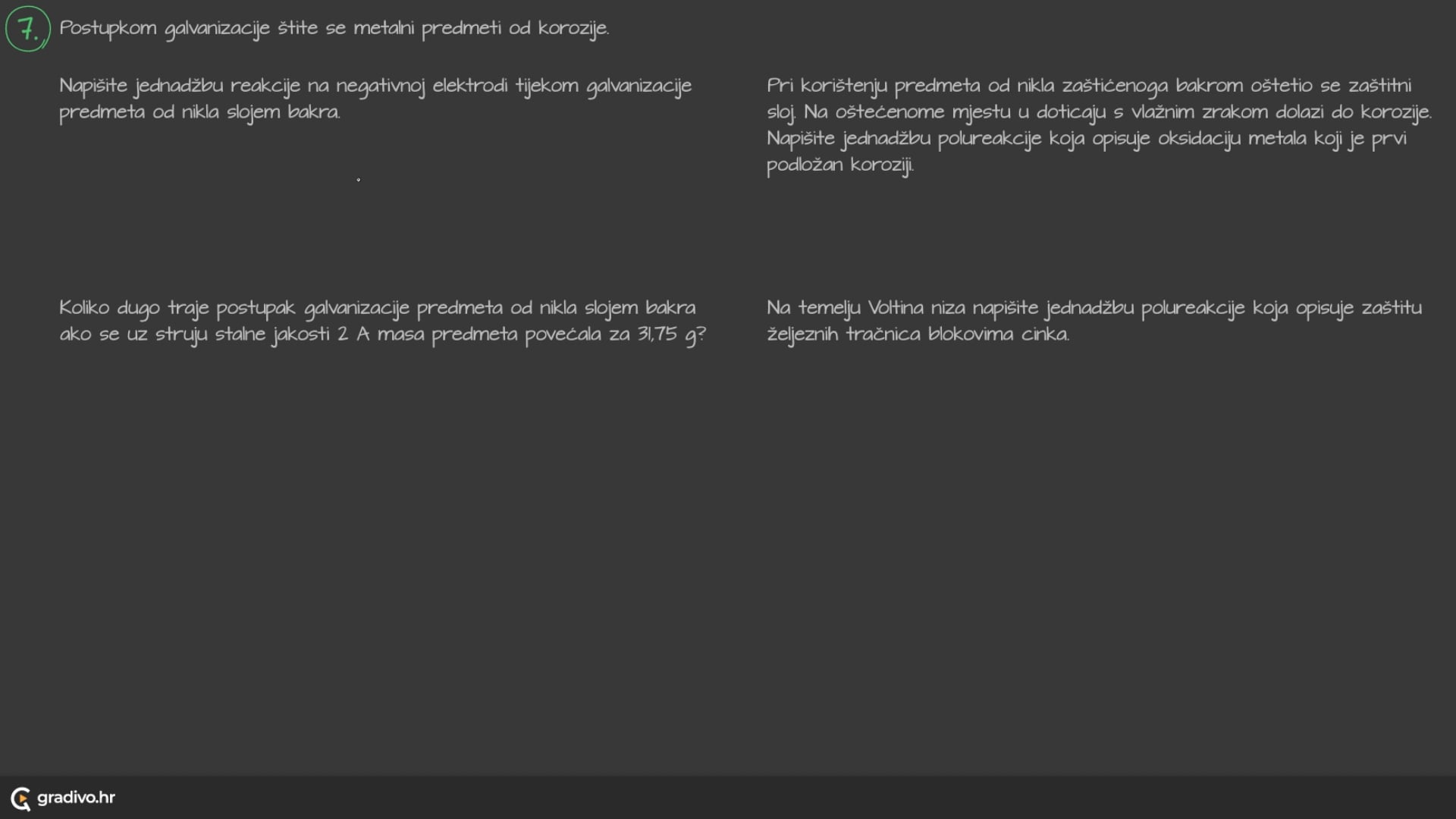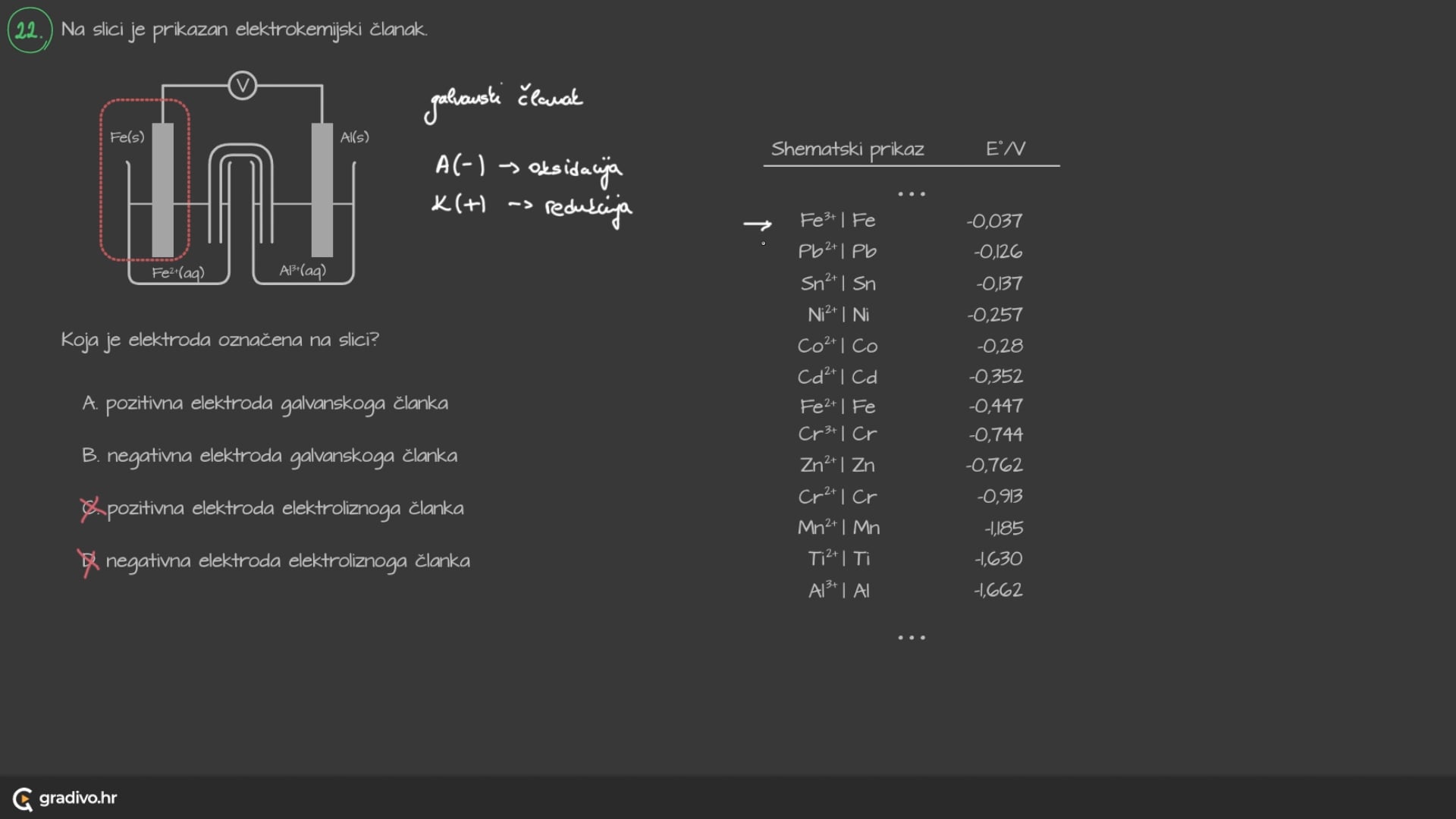 Jednadžbe kemijskih polureakcija za navedene elektrode te ione nalaze se u tablici.