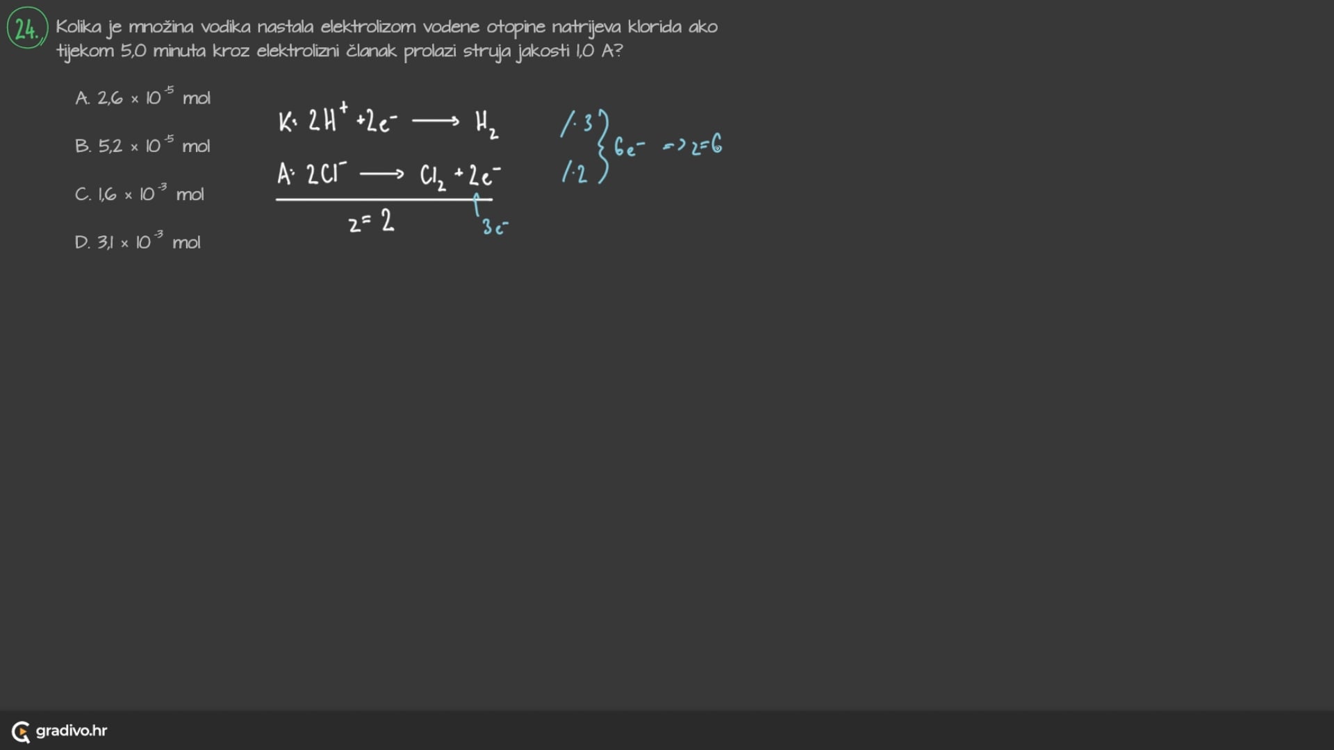 Pri elektrolizi vode na elektrodama se odvijaju sljedeće reakcije: