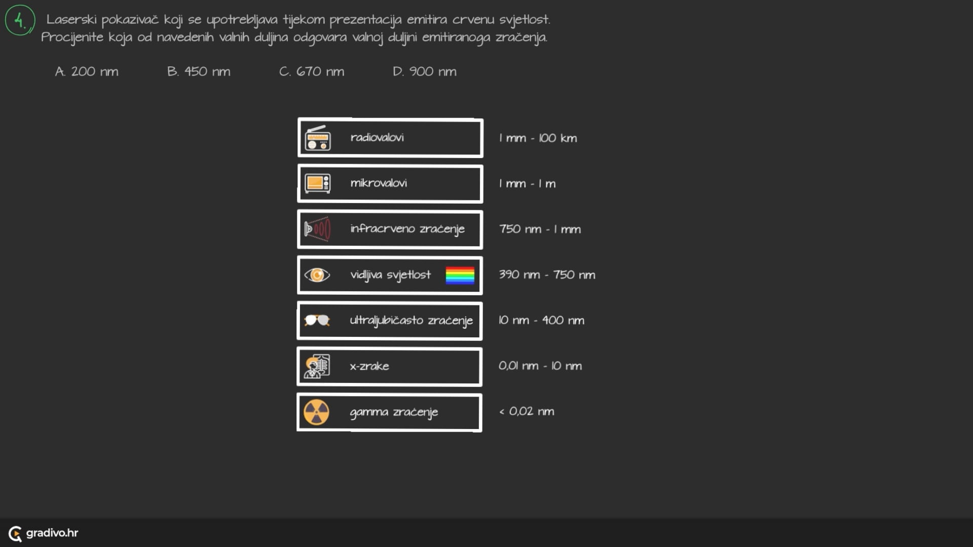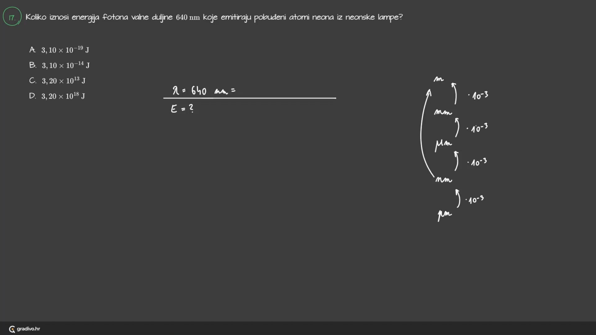 gdje je E = energija zračenja, h = Planckova konstanta, $h=6,62 \cdot 10^{-34} \mathrm{Js}$ , ν = frekvencija zračenja, c = brzina svjetlosti, λ = valna duljina.